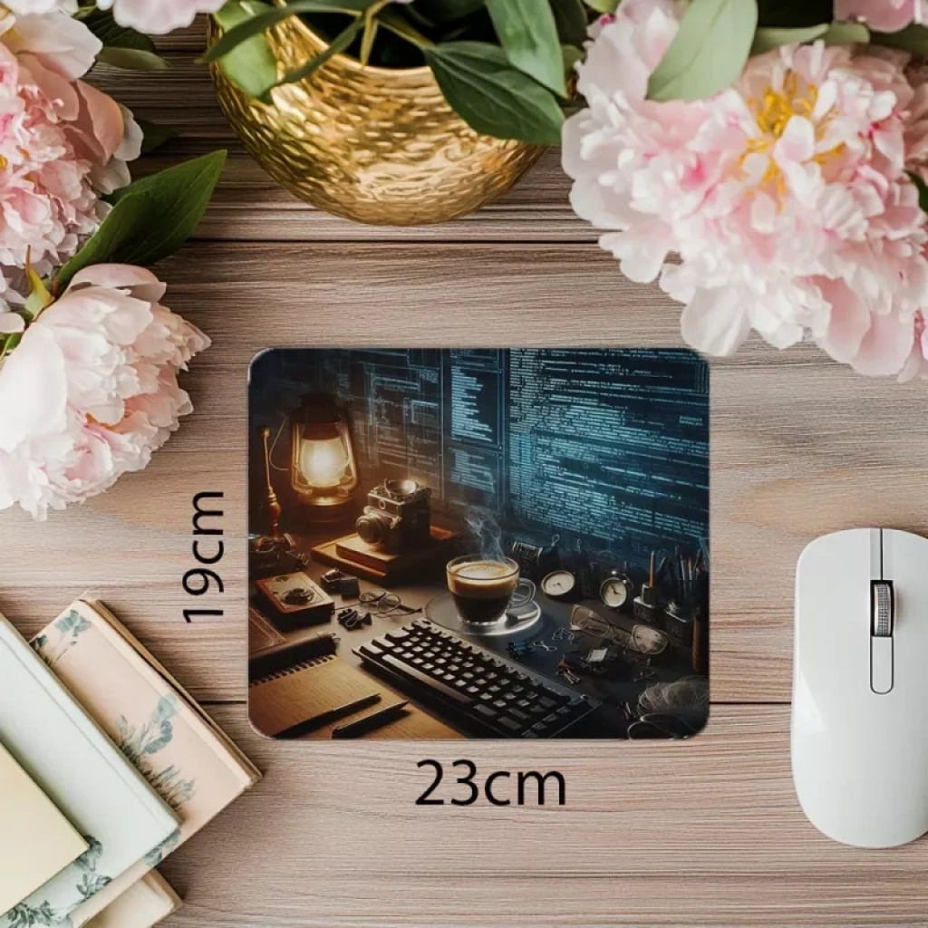 Cam bardakta espresso ve arka plandaki kod ışıklarıyla tasarlanan bu mousepad, yazılım tutkunları için sıcak ve odaklı bir atmosfer sunar. Kafein ve kodun eşsiz uyumu.