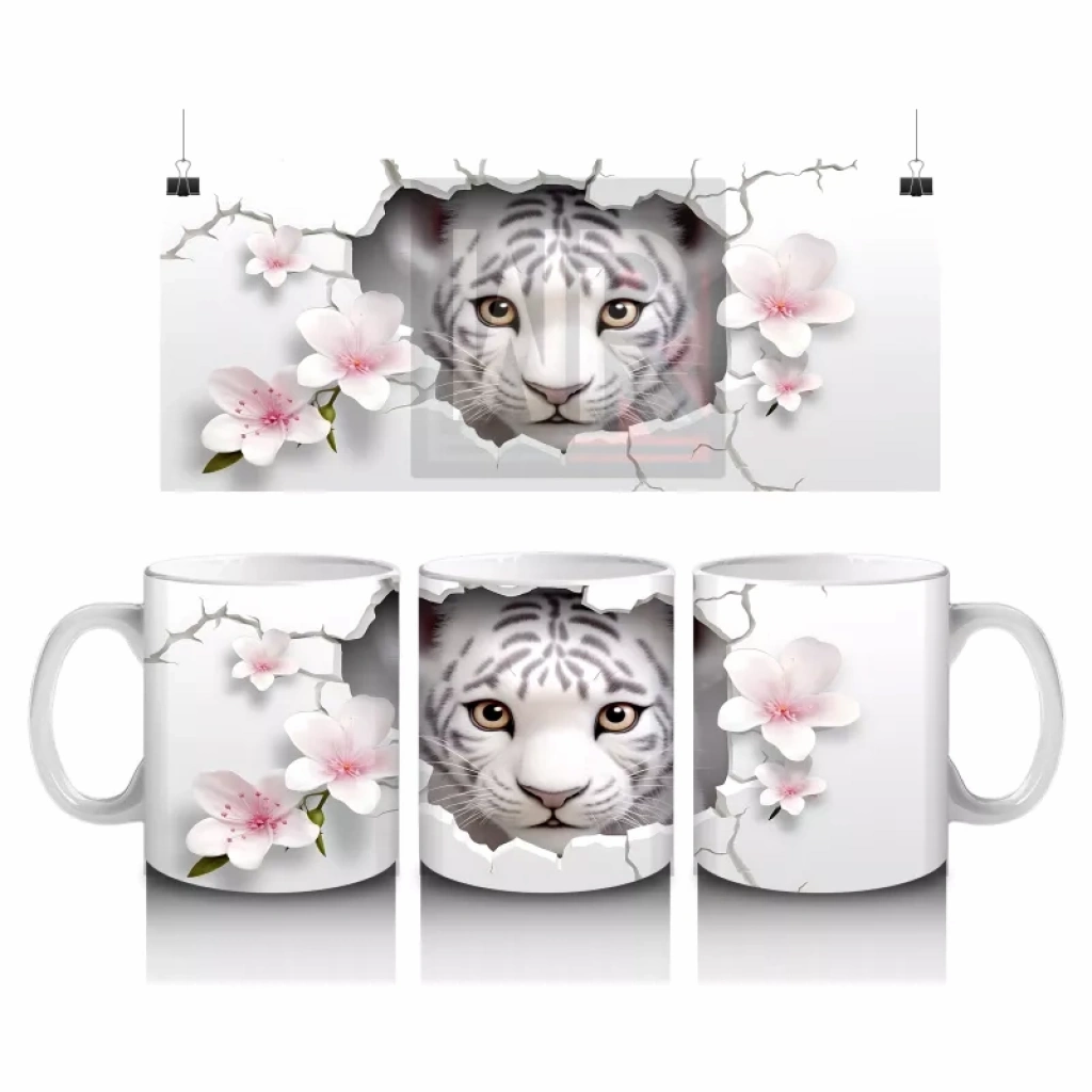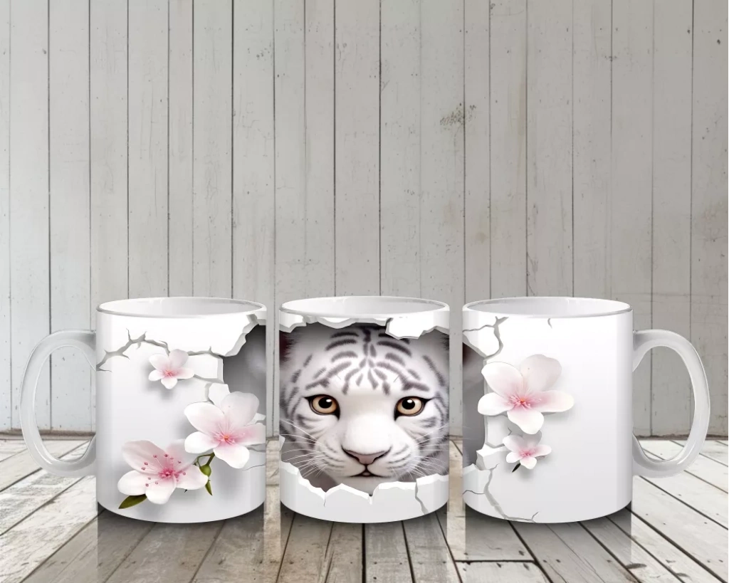 Çatlak Çiçekli Zeminden Bakan Beyaz Kaplan - Baskılı kahve kupası