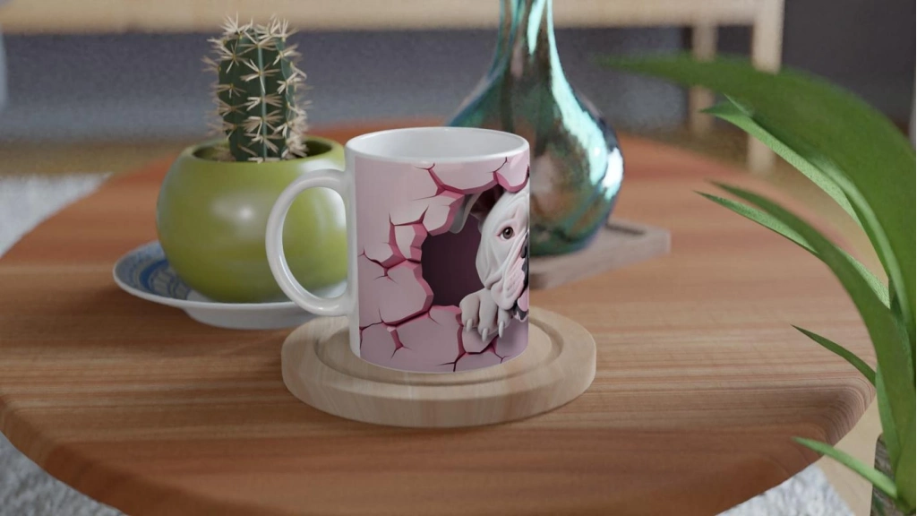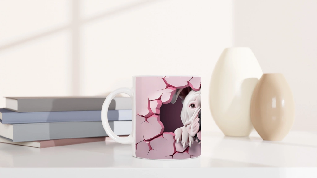 Çatlak Duvardan Bakan Bulldog Temalı Baskılı Kupa Bardak, pembe tonlardaki çatlamış duvar efektinin içinden dışarı bakan dilini çıkarmış sevimli bulldog figürüyle hem güçlü bir karakter hem de tatlı bir neşe sunuyor. Hayvan severlere özel, dikkat çeken bir tasarım.
