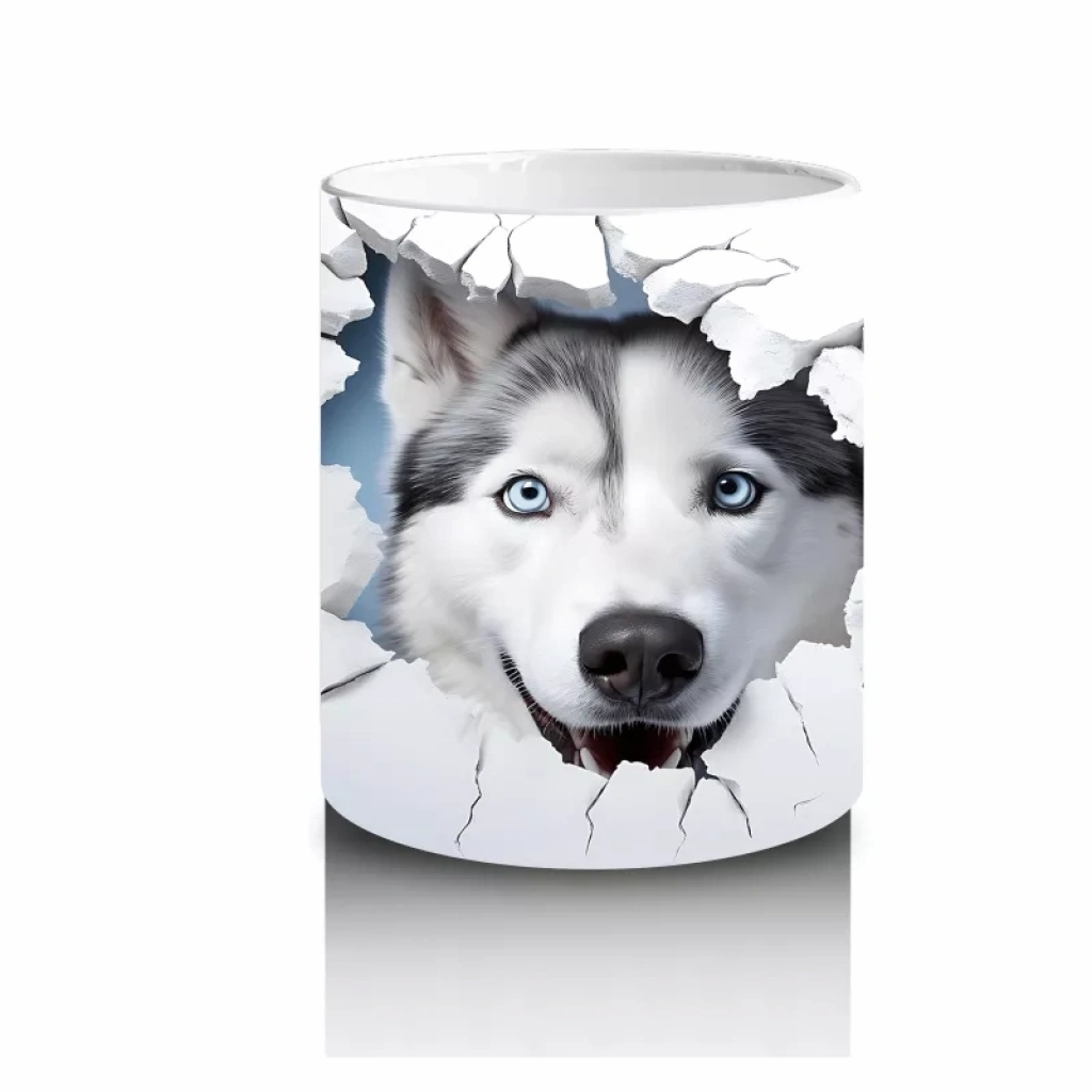 Çatlak duvarın ardından bakarken güçlü ve gizemli bir hava yayan gri kurt figürü, doğanın vahşi ruhunu sevenler için cesur ve etkileyici bir kupa tasarımı sunuyor.