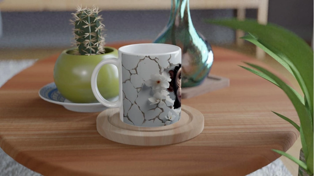 Çatlak Duvardan Bakan Sevimli Şempanze Temalı Baskılı Kupa Bardak, sade çatlak efektli arka planı ve zarif beyaz çiçek detaylarıyla dikkat çeker. Sevimli şempanzenin meraklı bakışları, kahve keyfinize doğayla iç içe bir anlam katar.