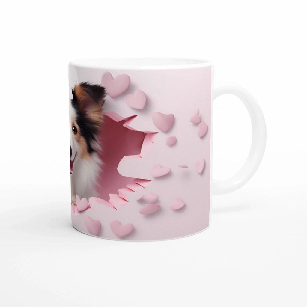 Çatlak Duvardan Bakan Sheltie Temalı Baskılı Kupa Bardak, pembe kalplerle çevrili çatlak duvar efekti ve enerjik bakışlı Sheltie köpeğiyle her içeceği sevgiyle buluşturur. Gülümseten detaylar arayanlar için mükemmel bir hediye seçeneği.