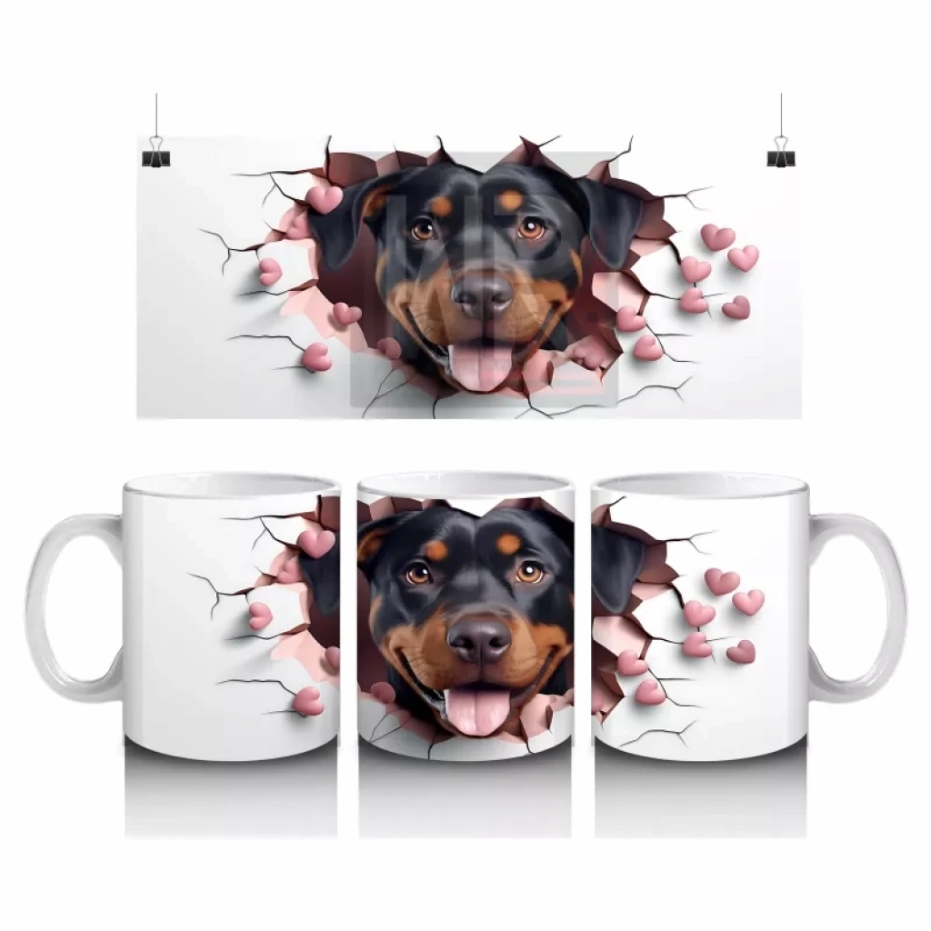 Çatlak duvarın ardından dikkatle bakan sevimli siyah köpek, meraklı ve korumacı ifadesiyle bu kupaya karakter katıyor. Sadık dostların enerjisi hep sizinle.