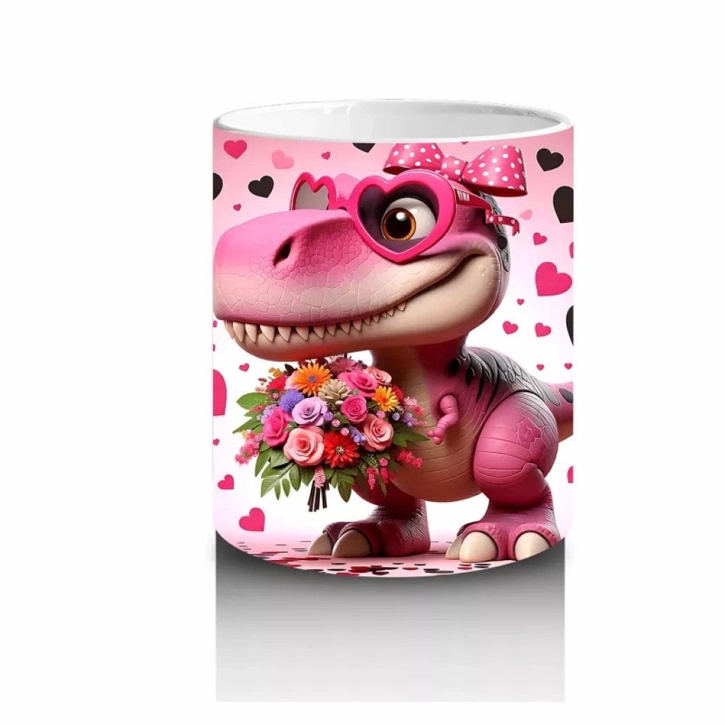Çiçek Buketi Tutan Dinozor Figürü – Baskılı Kahve Kupası