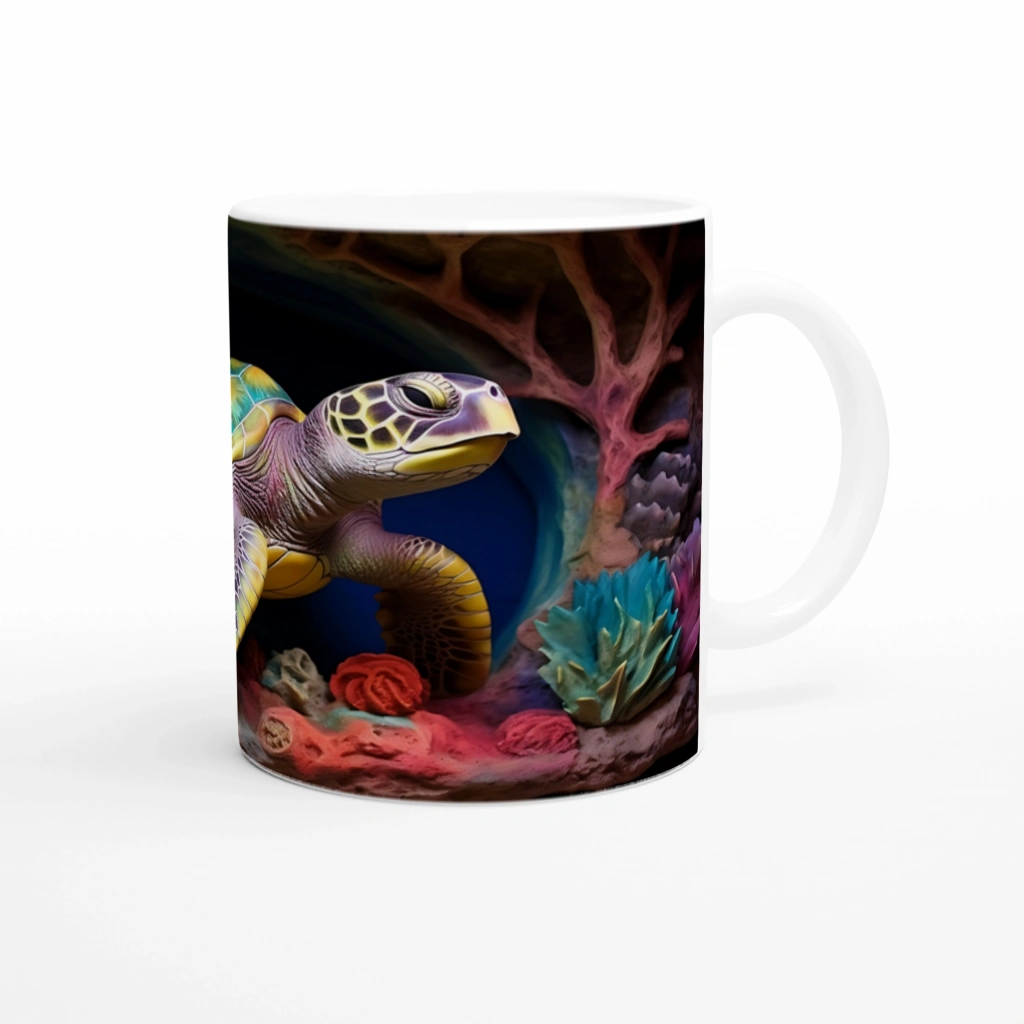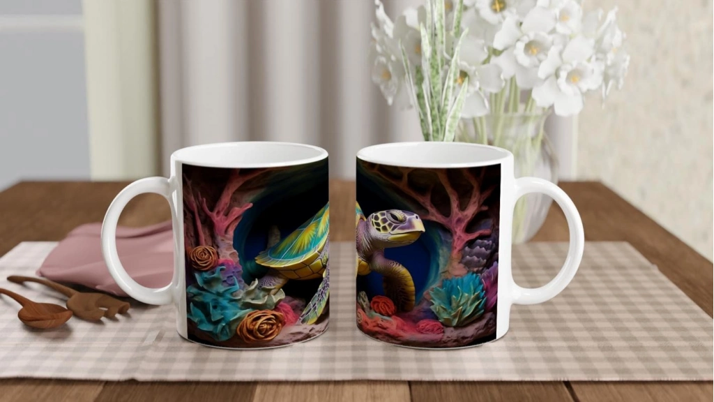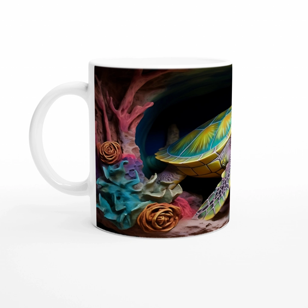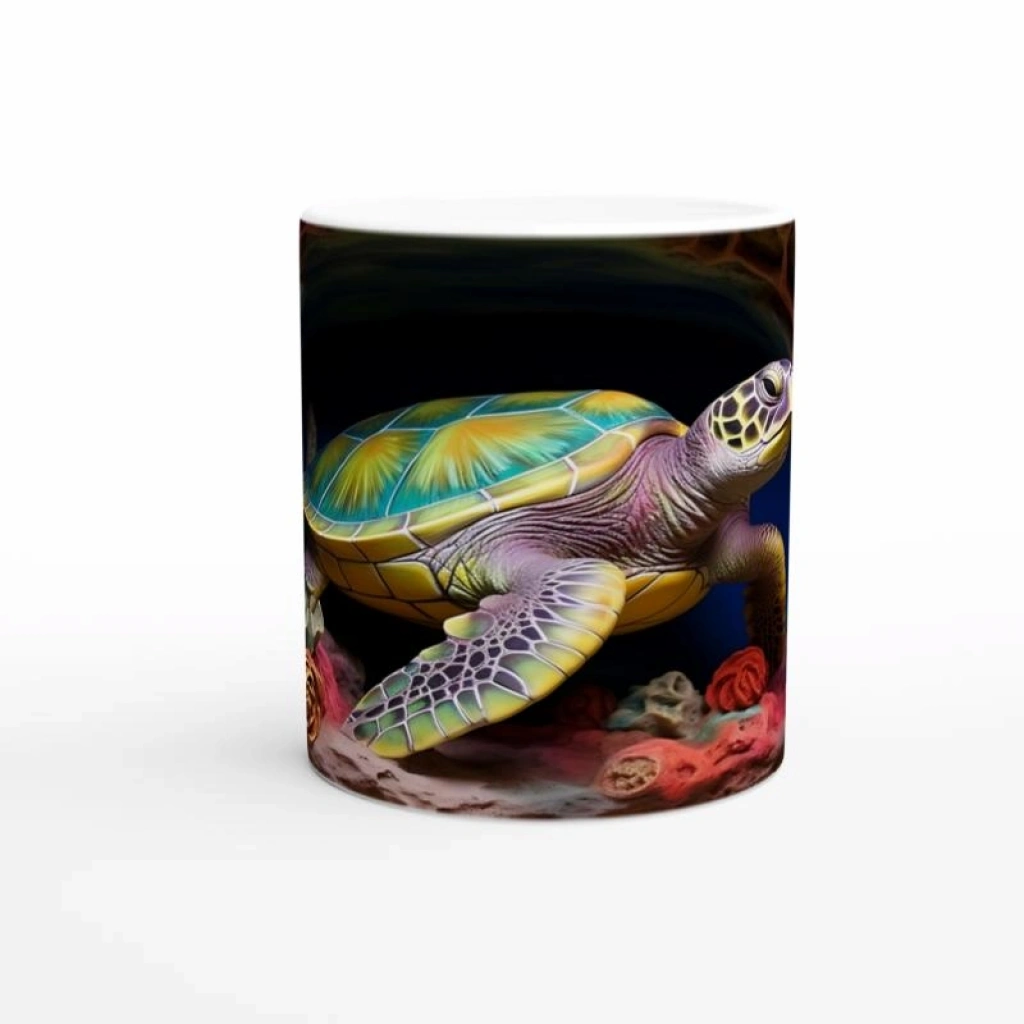 Canlı renkli mercan çiçekleriyle çevrelenmiş bu deniz kaplumbağalı kupa bardak, her yudumda tropik bir keşif duygusu uyandırır.
