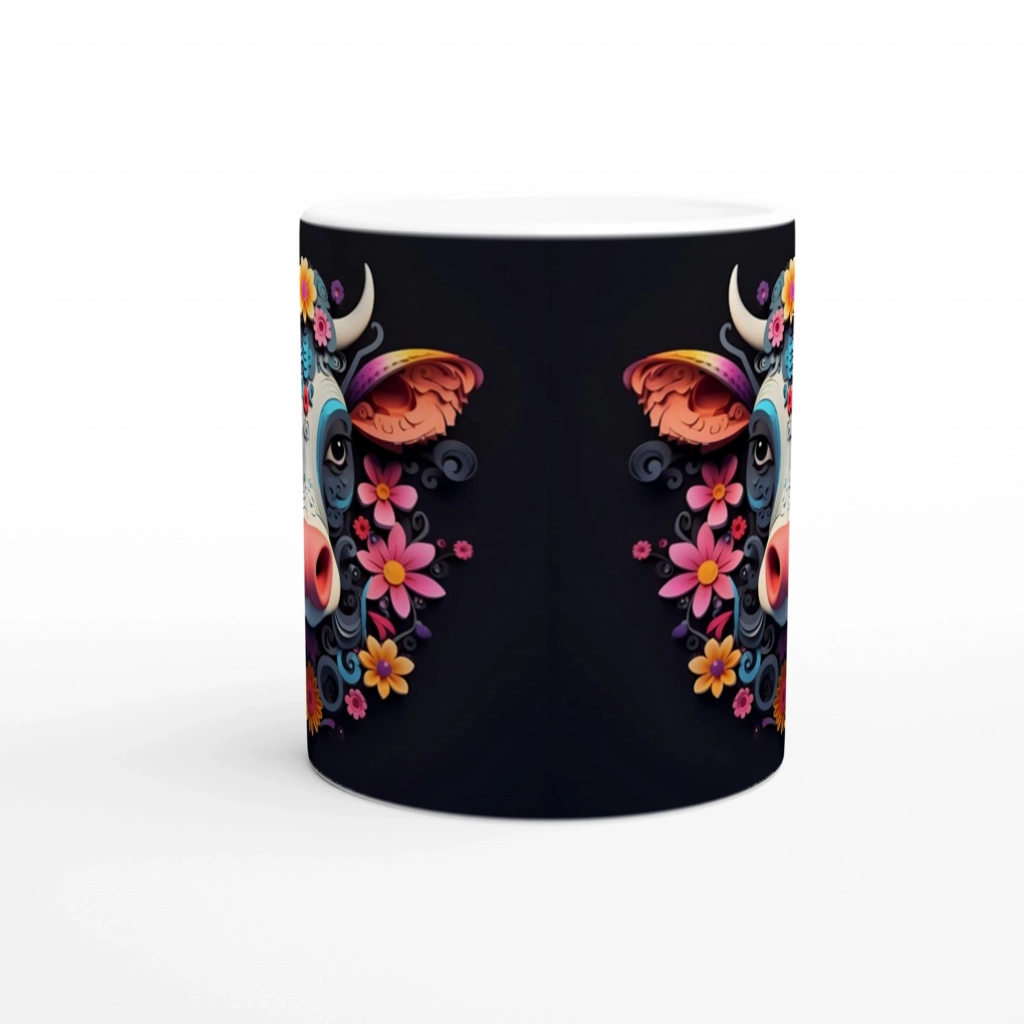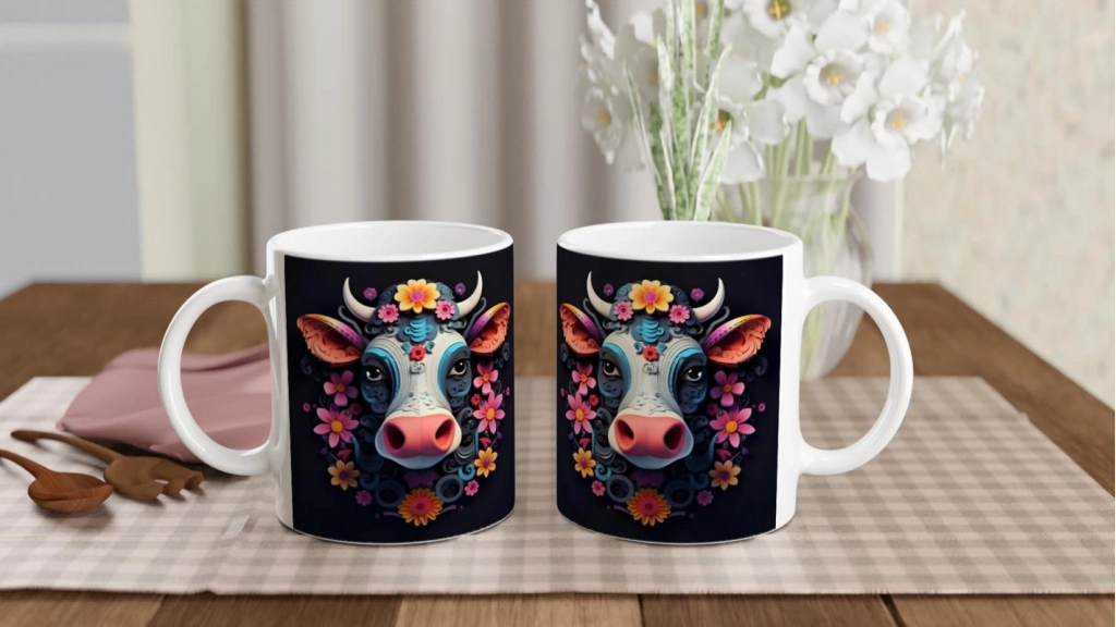 Neşeli bakışları ve çiçeklerle taçlandırılmış detaylı tasarımıyla bu inek baskılı kupa bardak,