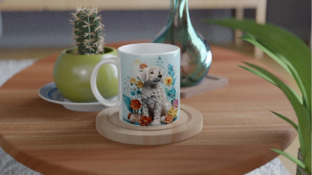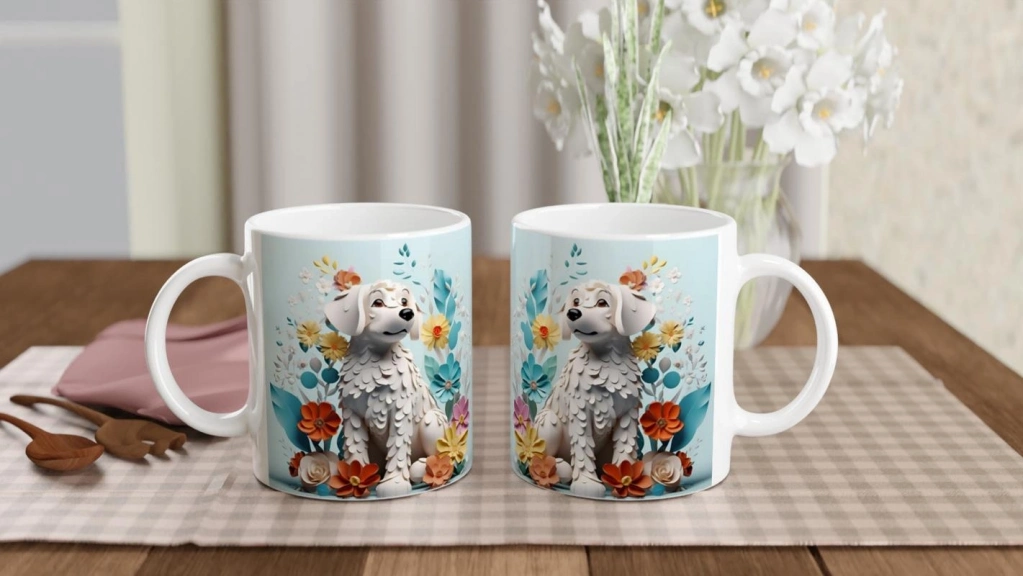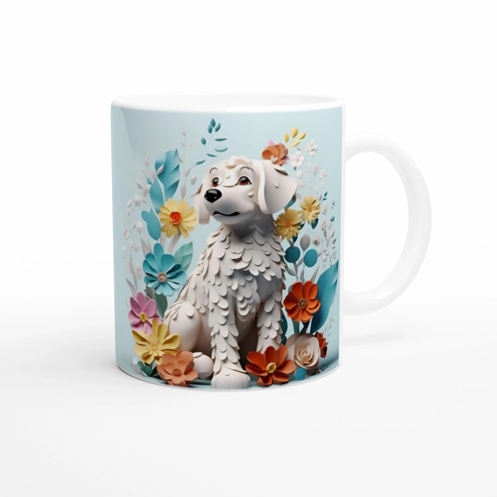 Sevimli, huzurlu ve stil sahibi! Bu beyaz köpek temalı kupa bardak, pastel renklerdeki çiçeklerle çevrelenmiş zarif bir tasarıma sahip.