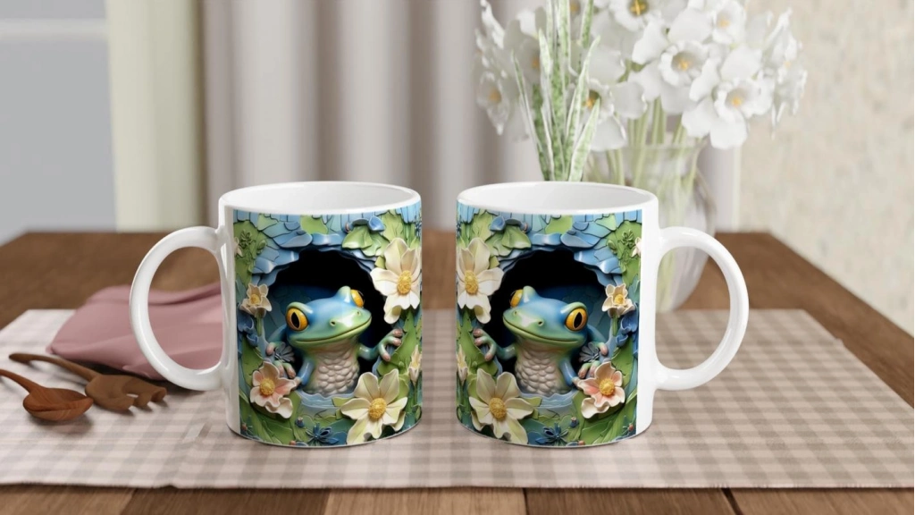 Rengarenk çiçeklerle bezeli duvarda beliren iki sevimli kurbağa, her yudumda baharın neşesini hissettiriyor. Bu tasarım, doğayı sevenler için eğlenceli ve özgün bir hediye alternatifi.
