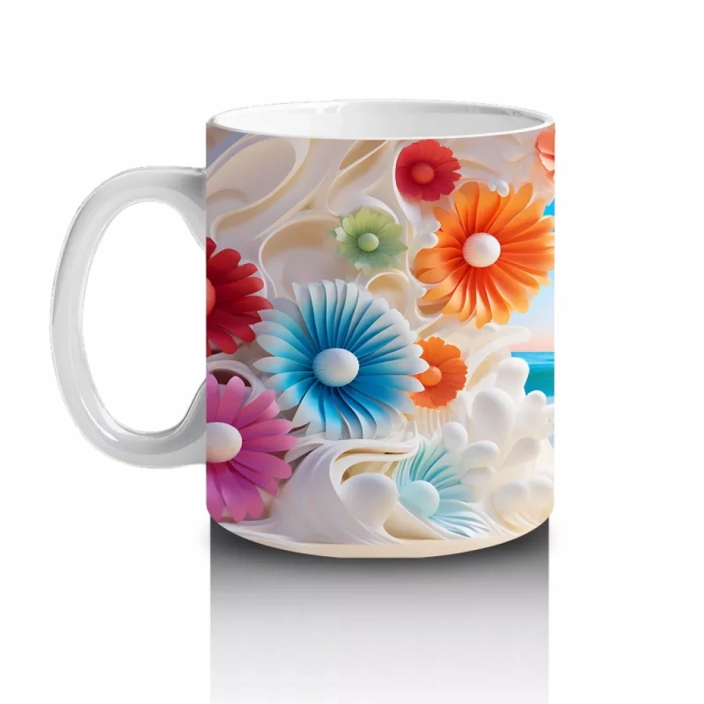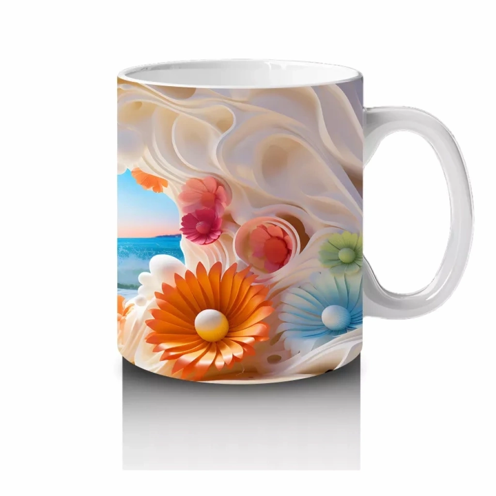 Renkli çiçeklerin arasından görünen tropik plaj manzarası, tatil özlemini her yudumda yaşatıyor. Yaz enerjisini evinize taşıyan bu tasarım, sıcak ve keyifli anlar için mükemmel bir tercih.