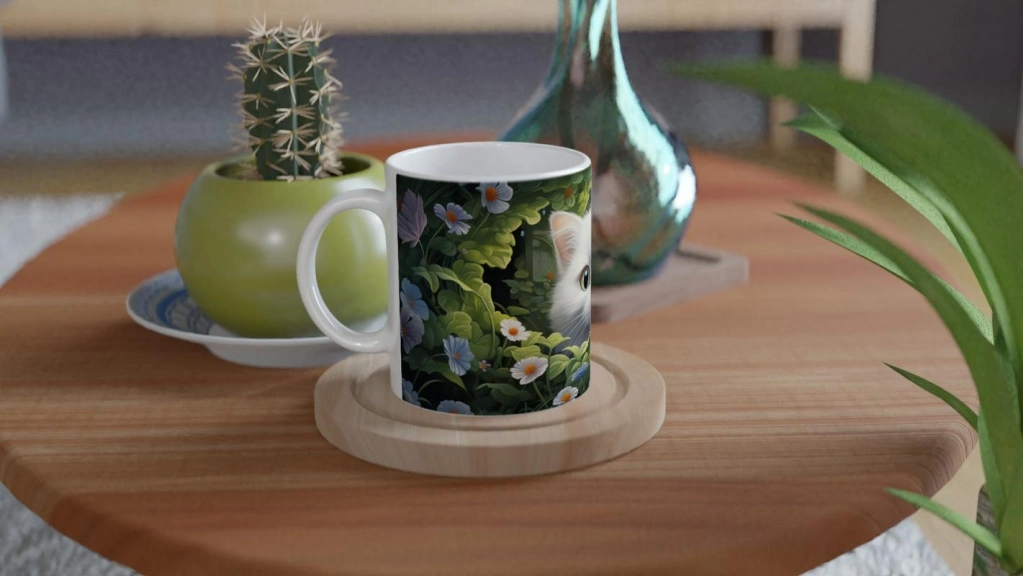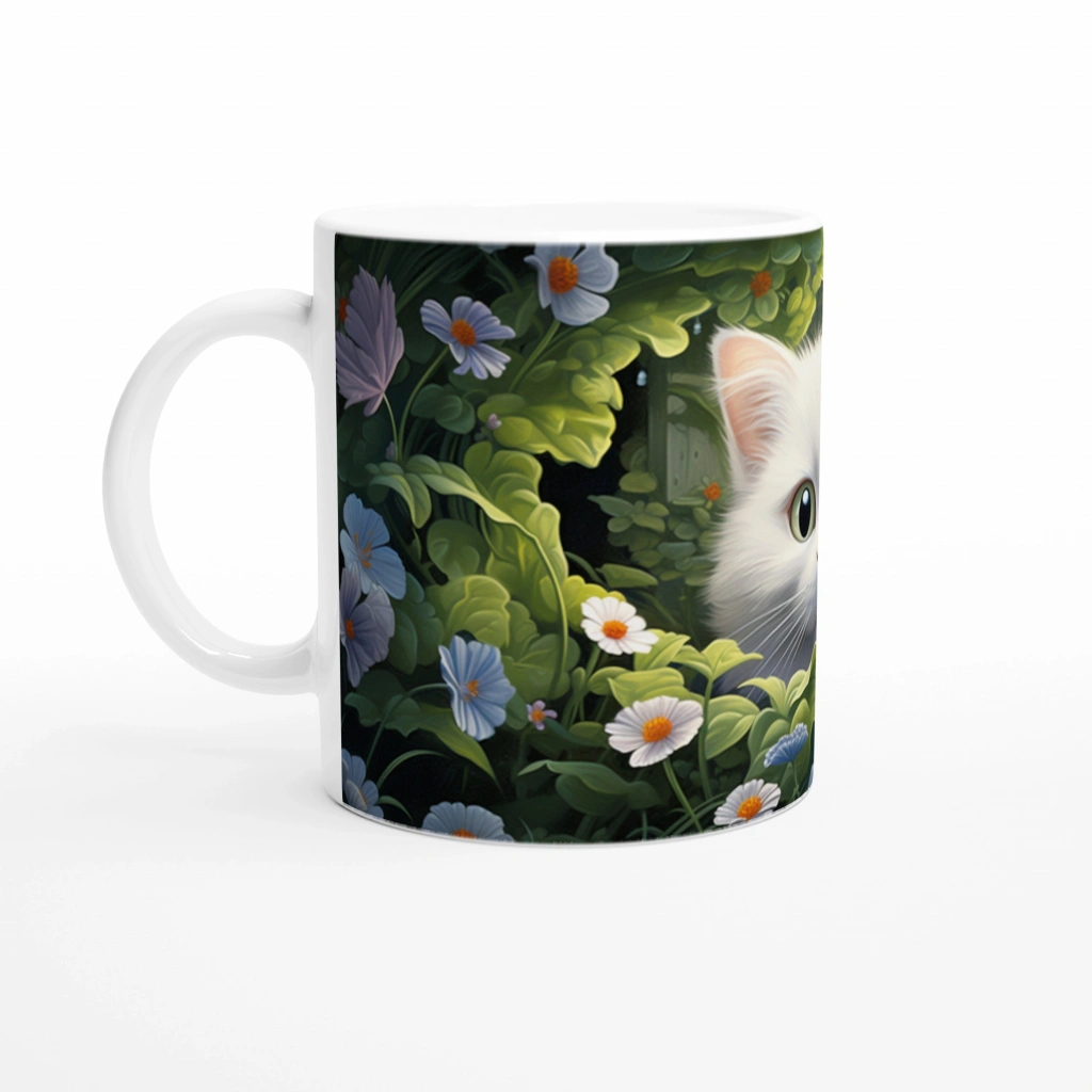 Çiçeklerle Çevrili Gizemli Beyaz Kedi Baskılı Kupa Bardak, sakinliği ve doğayla iç içe olan masalsı bir dünyayı sevenler için eşsiz bir tercih.