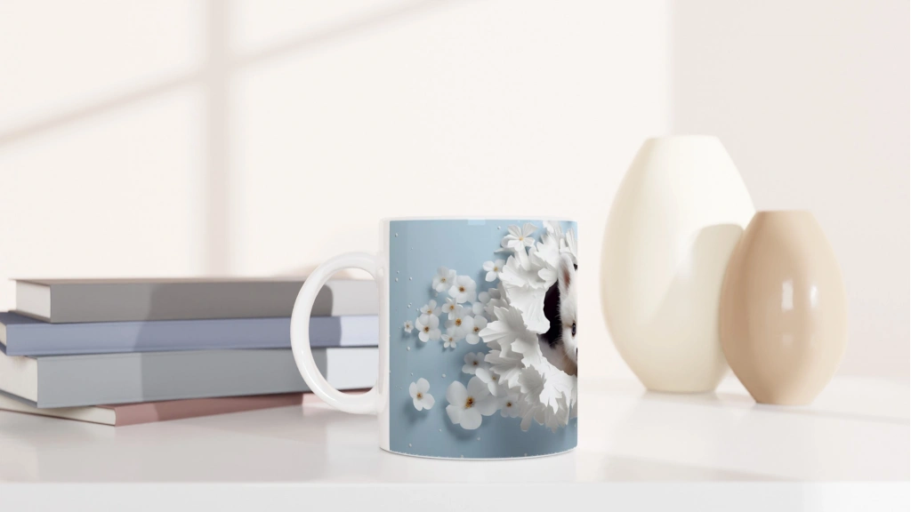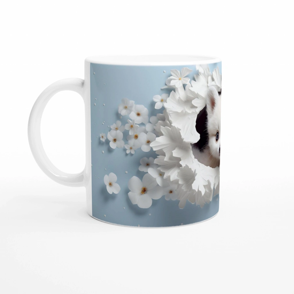 Çiçeklerle Çevrili Masum Pomeranian Temalı Baskılı Kupa Bardak, pastel mavi fon ve zarif beyaz çiçeklerle süslenmiş tasarımıyla hem göz alıcı hem de yumuşacık bir atmosfer sunuyor. Sevgi dolu bir hediye alternatifi olarak da ideal.
