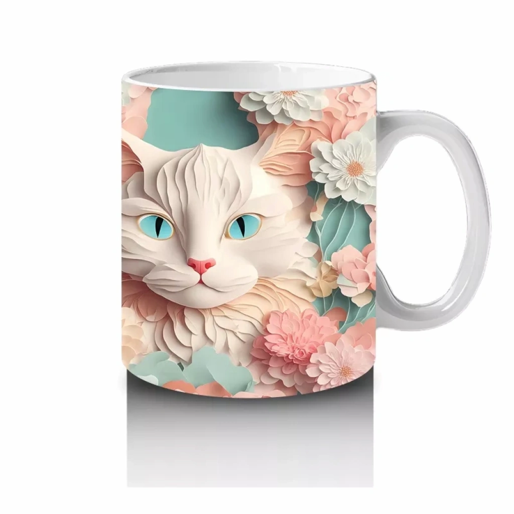 Çiçeklerle çevrili ve ayna efektiyle çoğaltılmış yavru kediler, zarif ve sanatsal bir görünüm sunuyor. Modern ve şık tasarımlar arayanlar için özel bir kupa.
