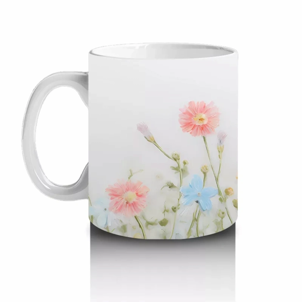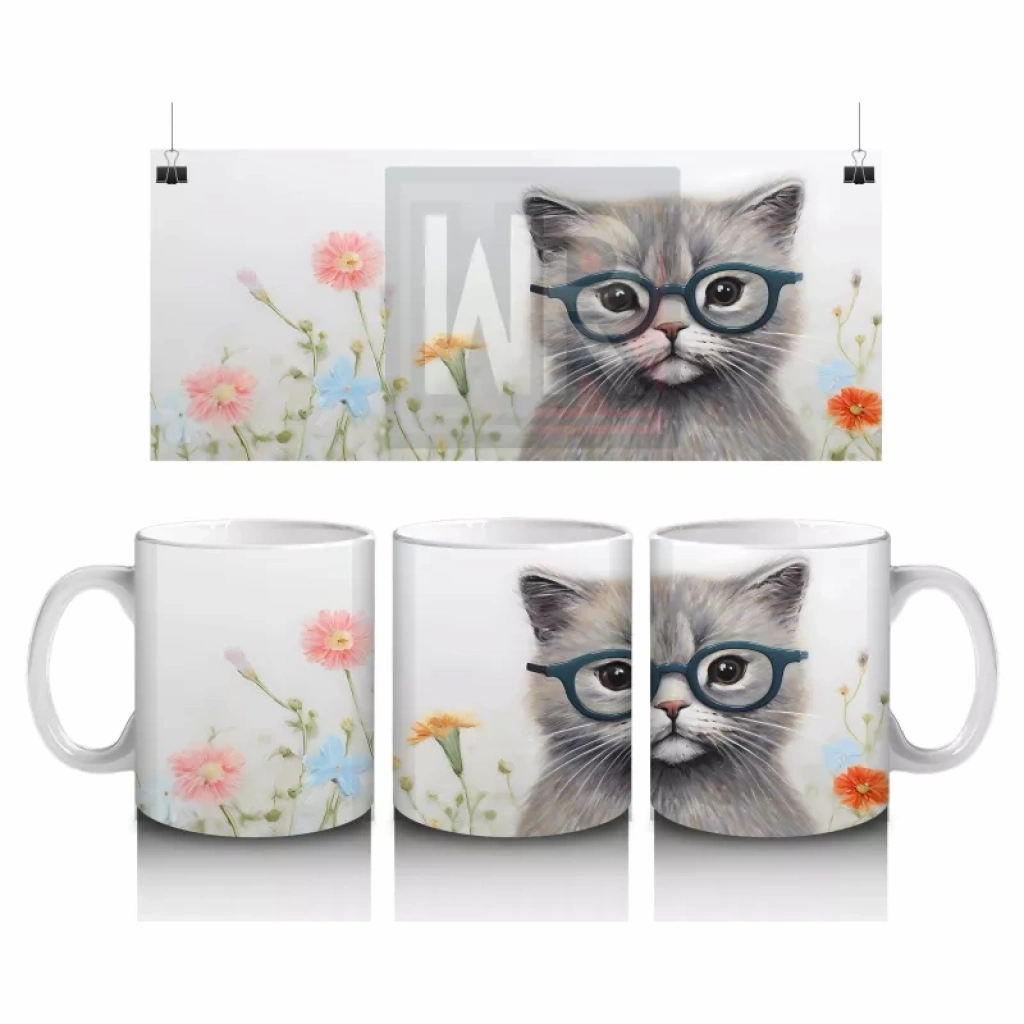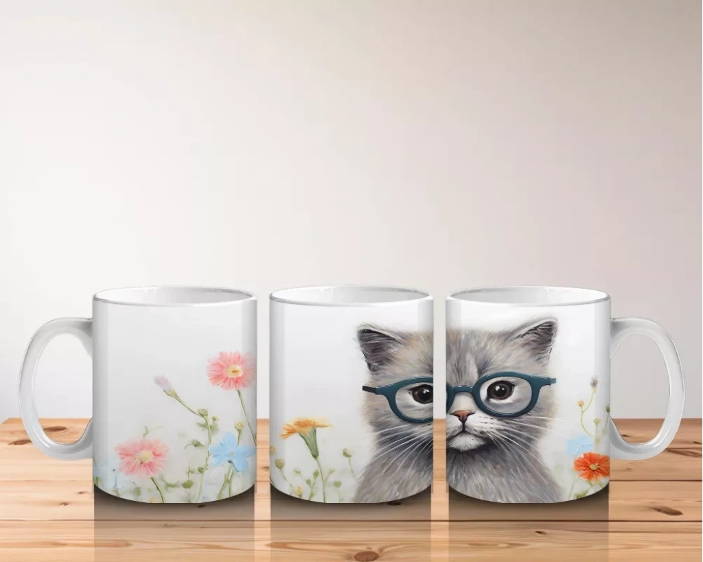 Çiçekli Zemin Üzerinde Gözlüklü Sevimli Kedi – Baskılı Kahve Kupası