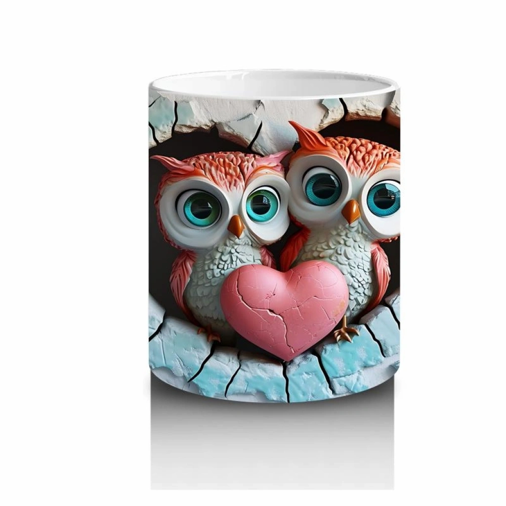 Çocuklara Sütü Sevdiren Duvarı Delip Bakan Kalp Baykuş Çifti Kupa Bardak