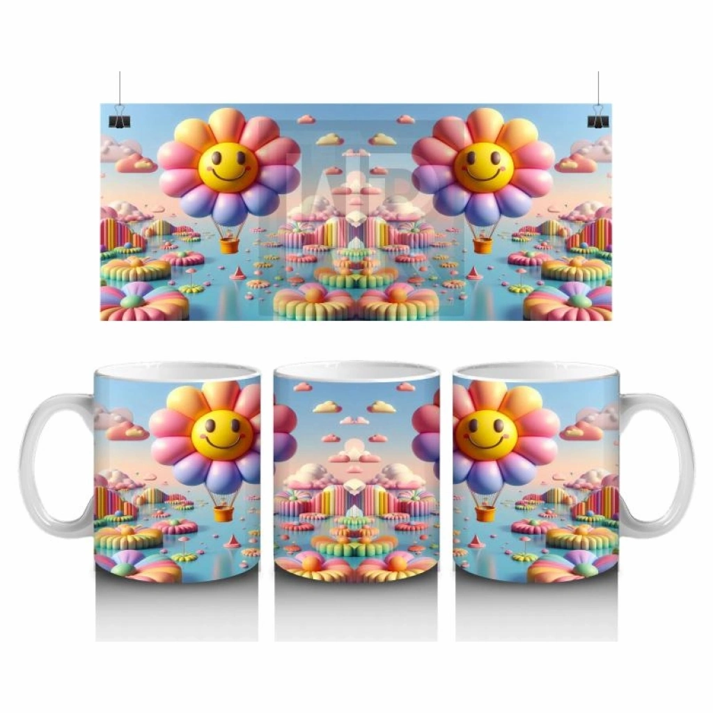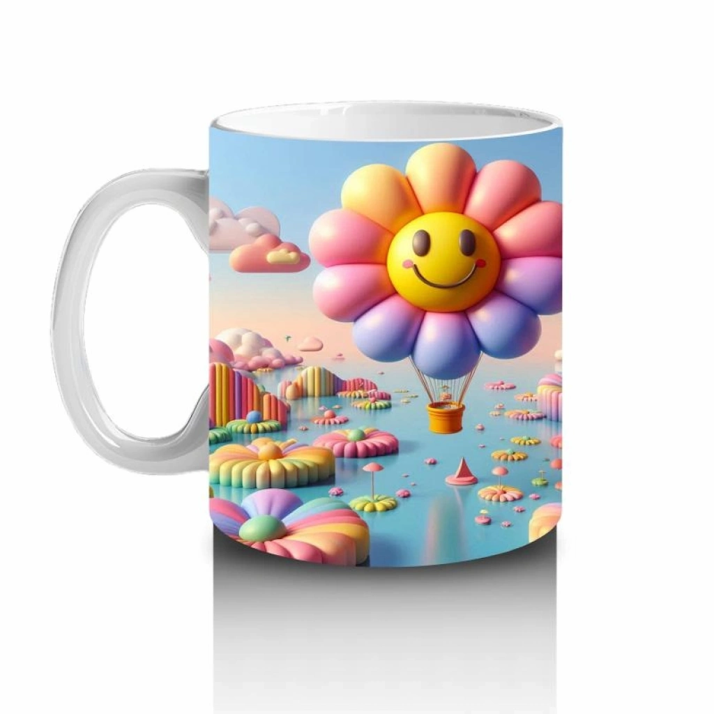 Çocuklara Sütü Sevdiren Gülümseyen Çiçek Balonlar ve Renkli Bulutlar Desenli Kupa Bardak