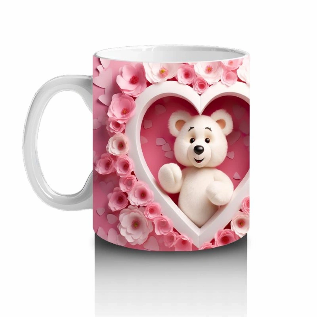 Çocuklara Sütü Sevdiren Kalpli Çerçevede Beyaz Ayıcık Desenli Kupa Bardak