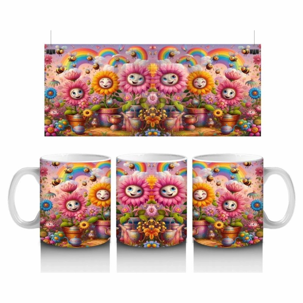 Çocuklara Sütü Sevdiren Neşeli Yüzlü Çiçekler ve Gökkuşağı Desenli Kupa Bardak