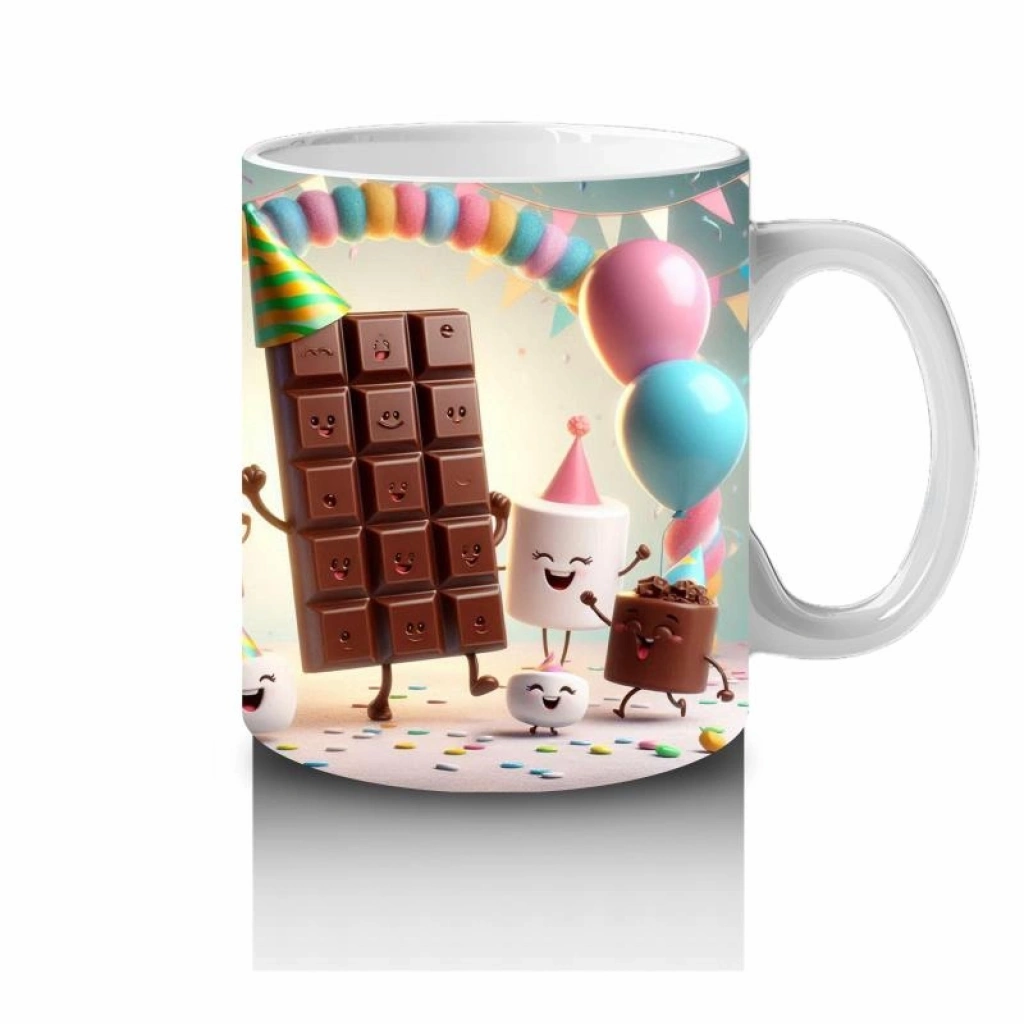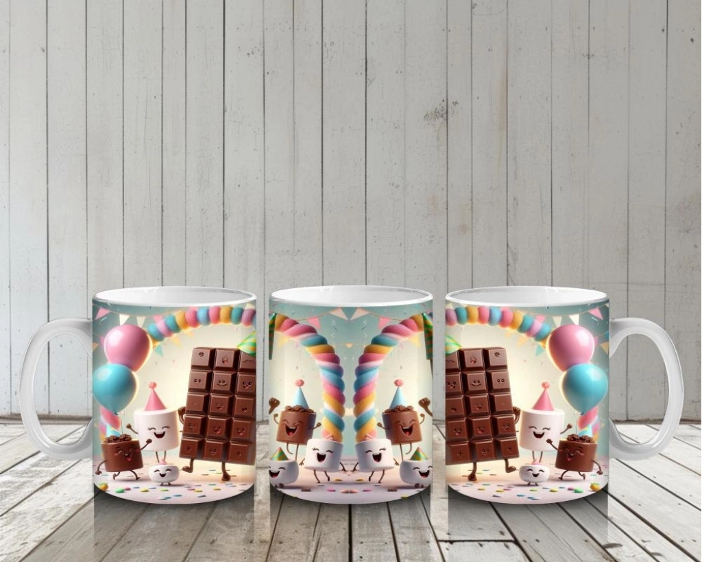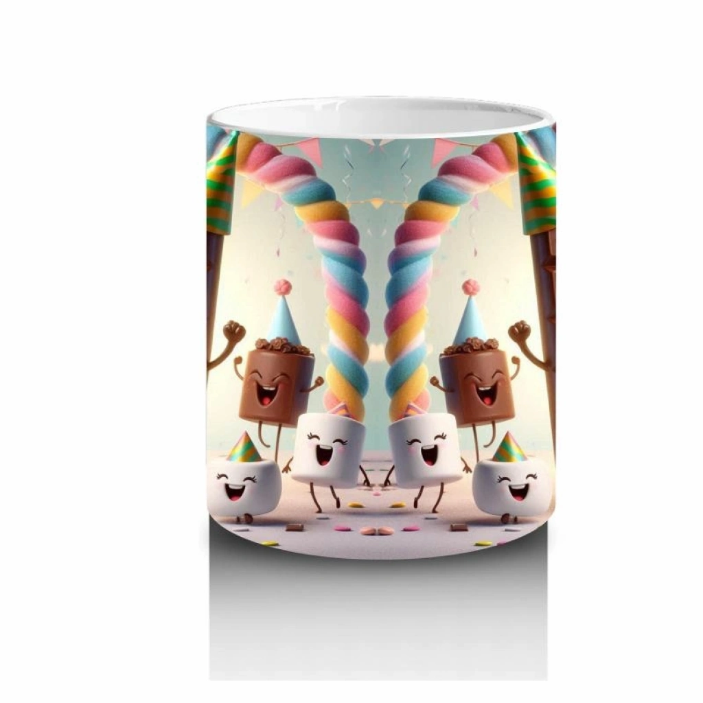 Çocuklara Sütü Sevdiren Parti Şapkalı Çikolata ve Marshmallowlar Desenli Kupa Bardak