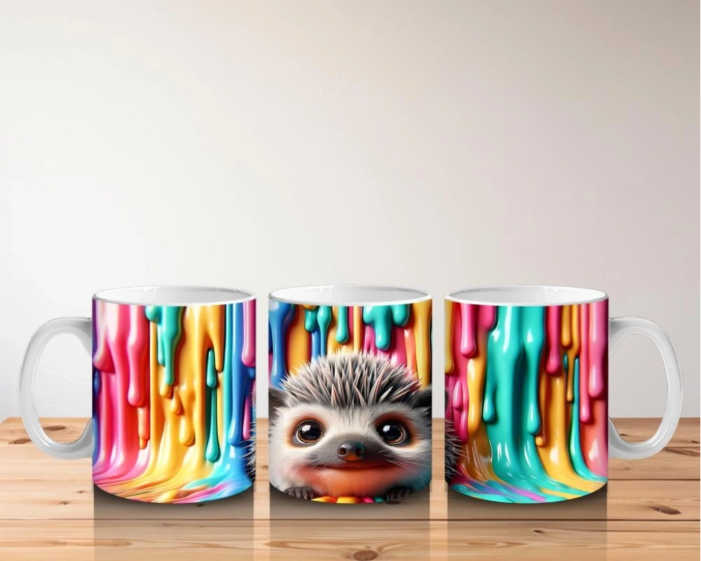 Çocuklara Sütü Sevdiren Renkli Boya Dalgaları Arasında Neşeli Kirpi Kupa Bardak