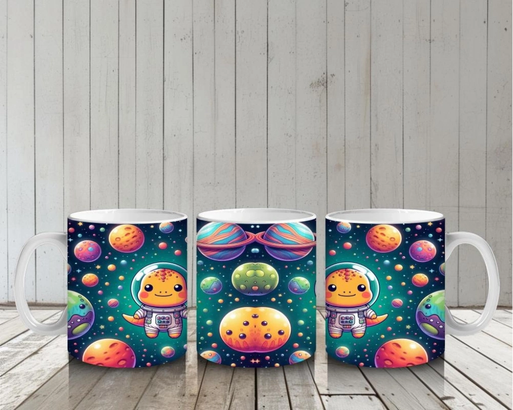 Çocuklara Sütü Sevdiren Sevimli Astronot Dinozor ve Renkli Gezegenler Desenli Kupa Bardak