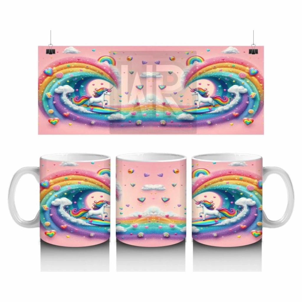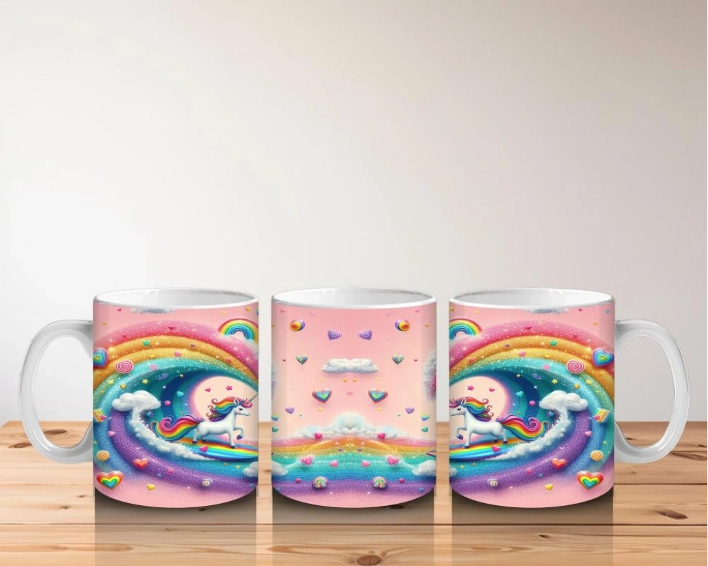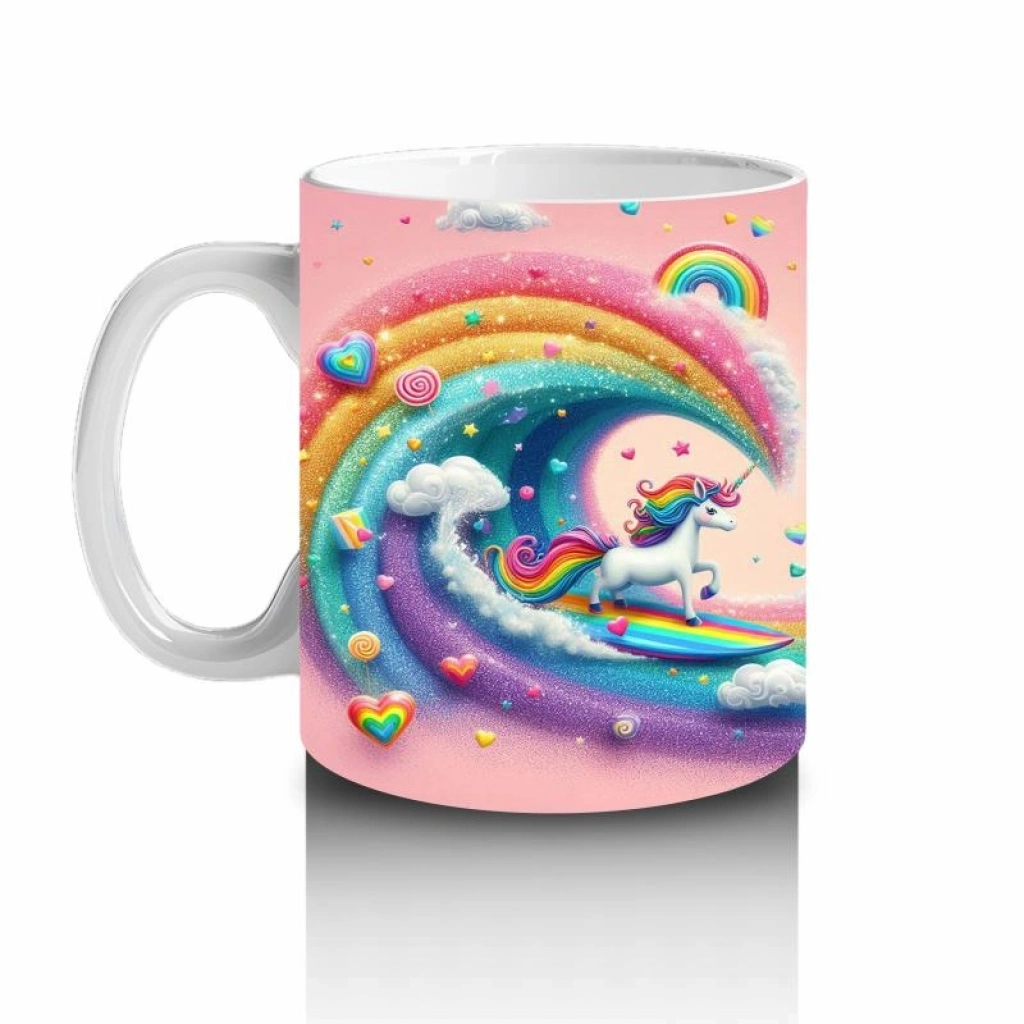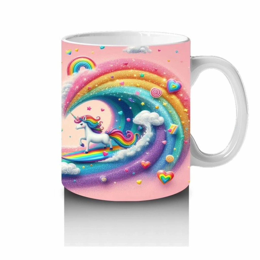 Gökkuşağı dalgalarında sörf yapan enerjik bir unicorn! Bu rengârenk kupa, çocuklara süt içerken eğlence ve hayal gücünü bir arada sunuyor.