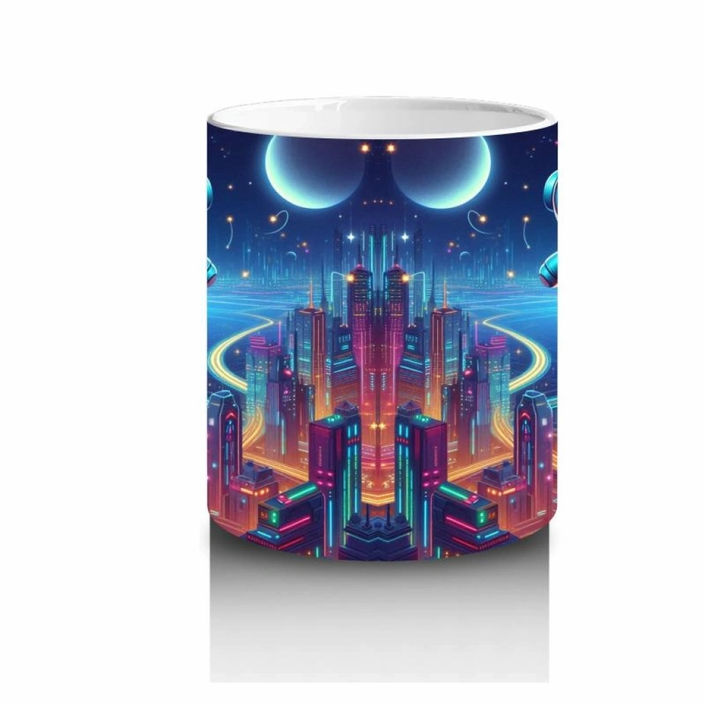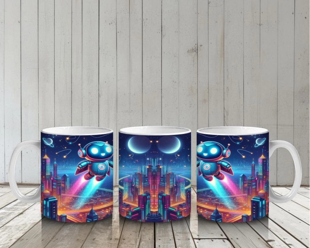 Çocuklara Sütü Sevdiren Uçan Sevimli Robotlar ve Gelecek Şehri Desenli Kupa Bardak