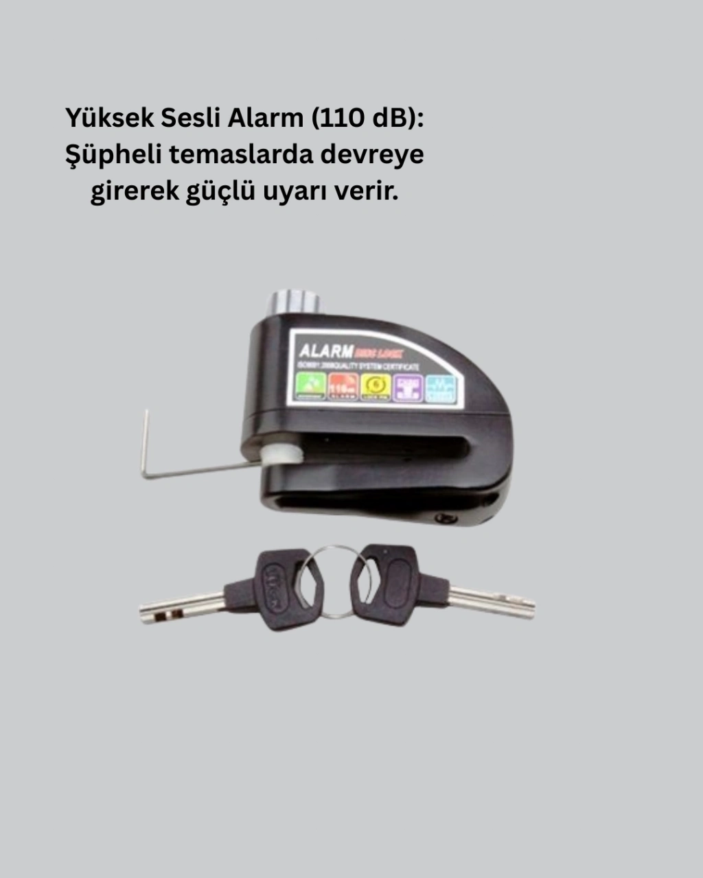 110 dB alarm disk kilidi, motosikletinizi ve bisikletinizi park halindeyken güvence altına alır. 7 mm kalınlığındaki kilit pimiyle güçlü kilitleme sağlar. Şok sensörü aracın hareket ettirilmek istendiğini algıladığında yüksek sesli alarm devreye girerek çevreyi uyarır. Dayanıklı metal gövdesi darbeye karşı dayanıklıdır. Su geçirmez yapısı sayesinde yağmurlu havalarda dahi güvenle kullanılabilir. Paslanmaz özelliği ile uzun ömürlüdür. Kullanımı kolaydır; silindire basıldığında kilitlenir ve alarm aktif hale gelir. Kompakt boyutu ile kolayca taşınabilir. Paket içerisinde fren kilidi ve 2 adet anahtar bulunur.