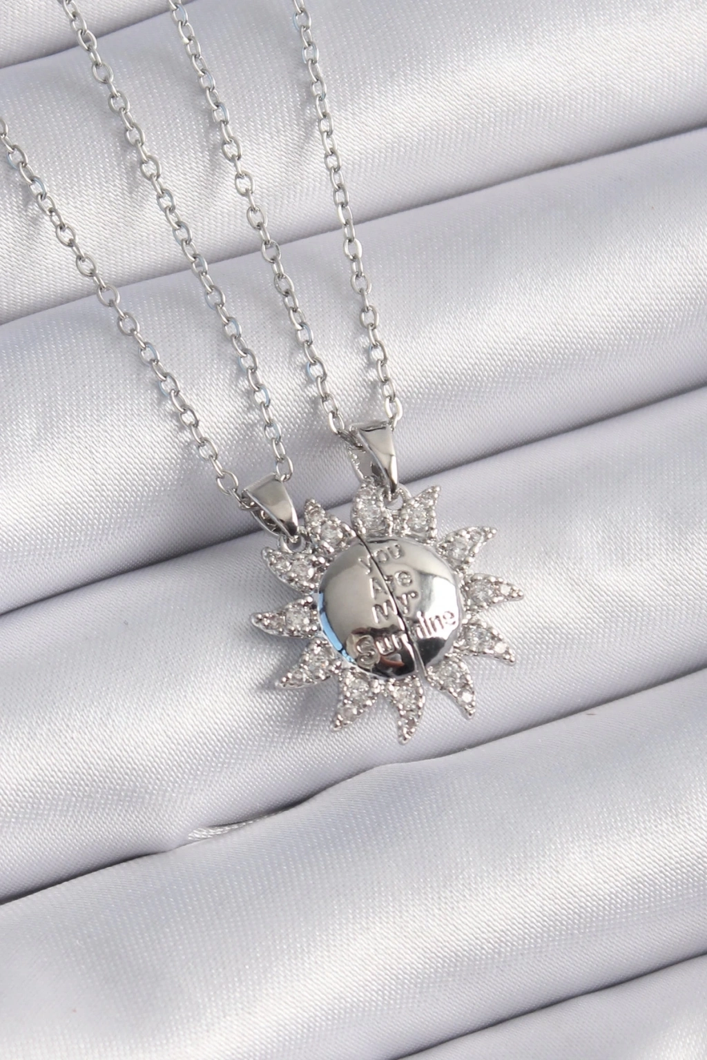 ÇOK SATAN 316L Çelik Gümüş Renk Zirkon Taşlı Güneş Model İşleme Yazı Detay Arkadaşlık Kolyesi