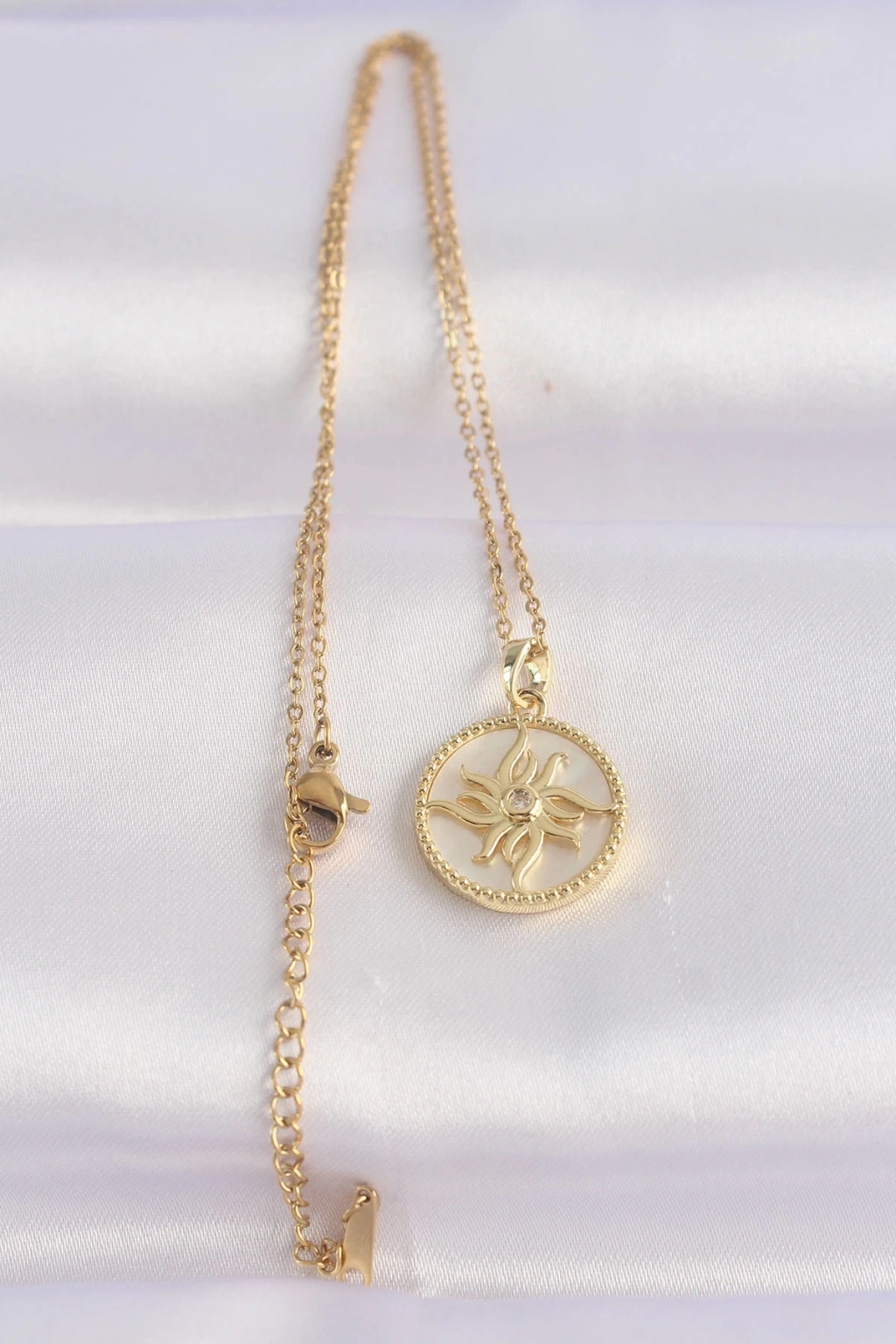 BFS 316L Çelik Zincir Altın Renk Zirkon Taşlı Oval Tasarım Güneş Kolye