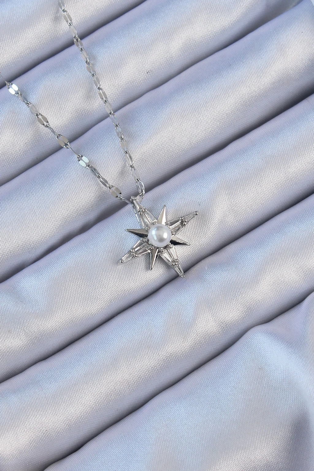 BFS 316L Çelik Zincir Gümüş Renk Baget Taşlı İnci Detay Kutup Yıldızı Kolye