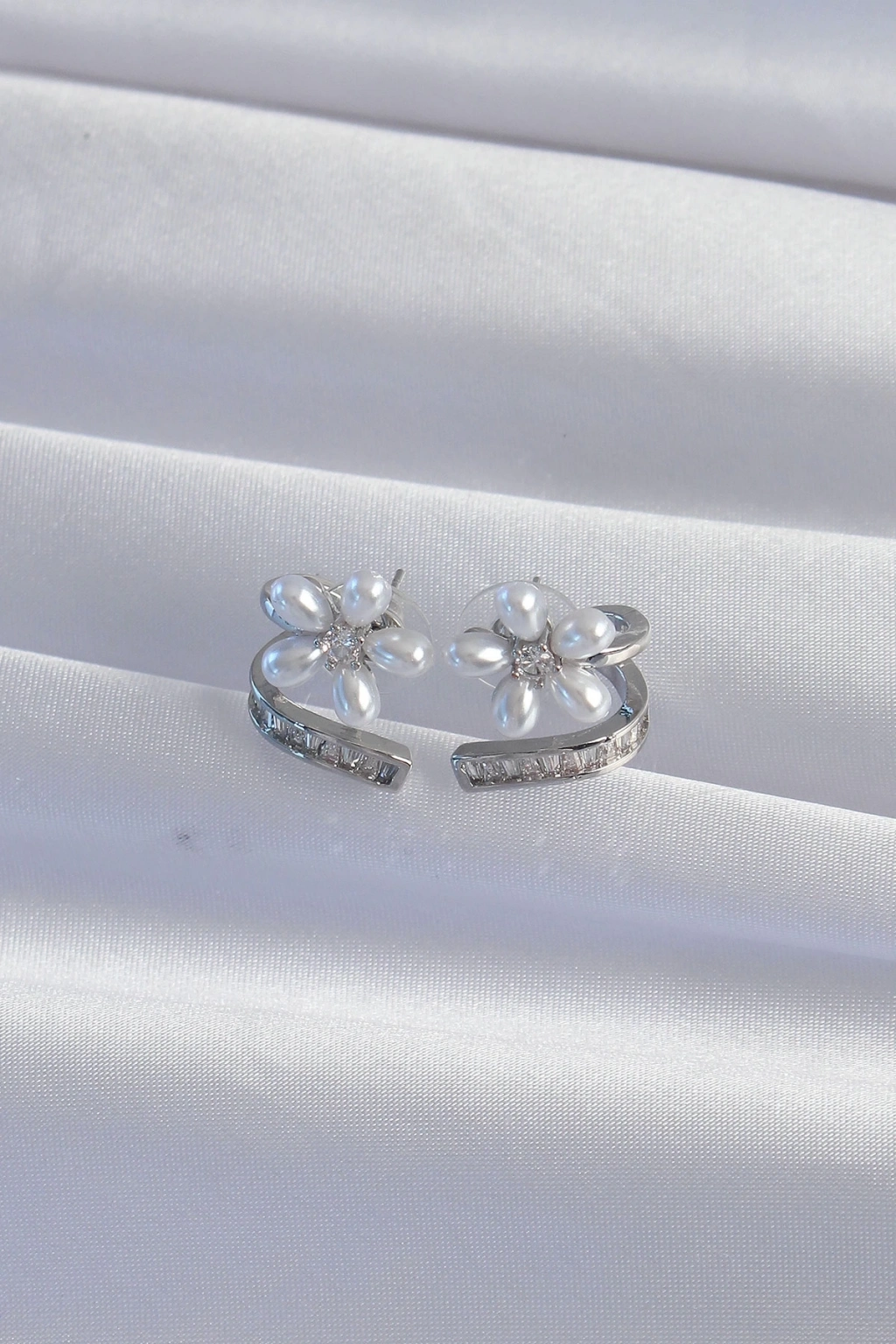 BFS Pirinç Gümüş Renk Zirkon Taşlı Kıvrımlı İnci Çiçek Küpe