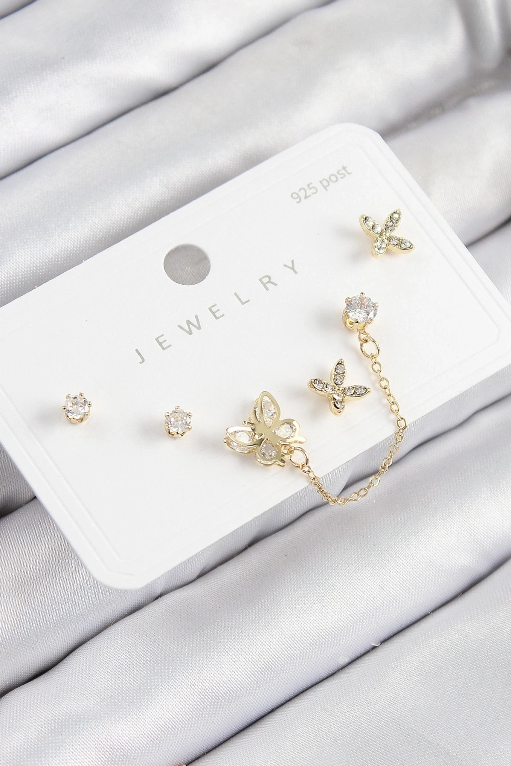 • BFS Pirinç Zirkon Taşlı Kelebek Model Gold Renk 925 Ayar Gümüş Çivi Kadın Küpe Set