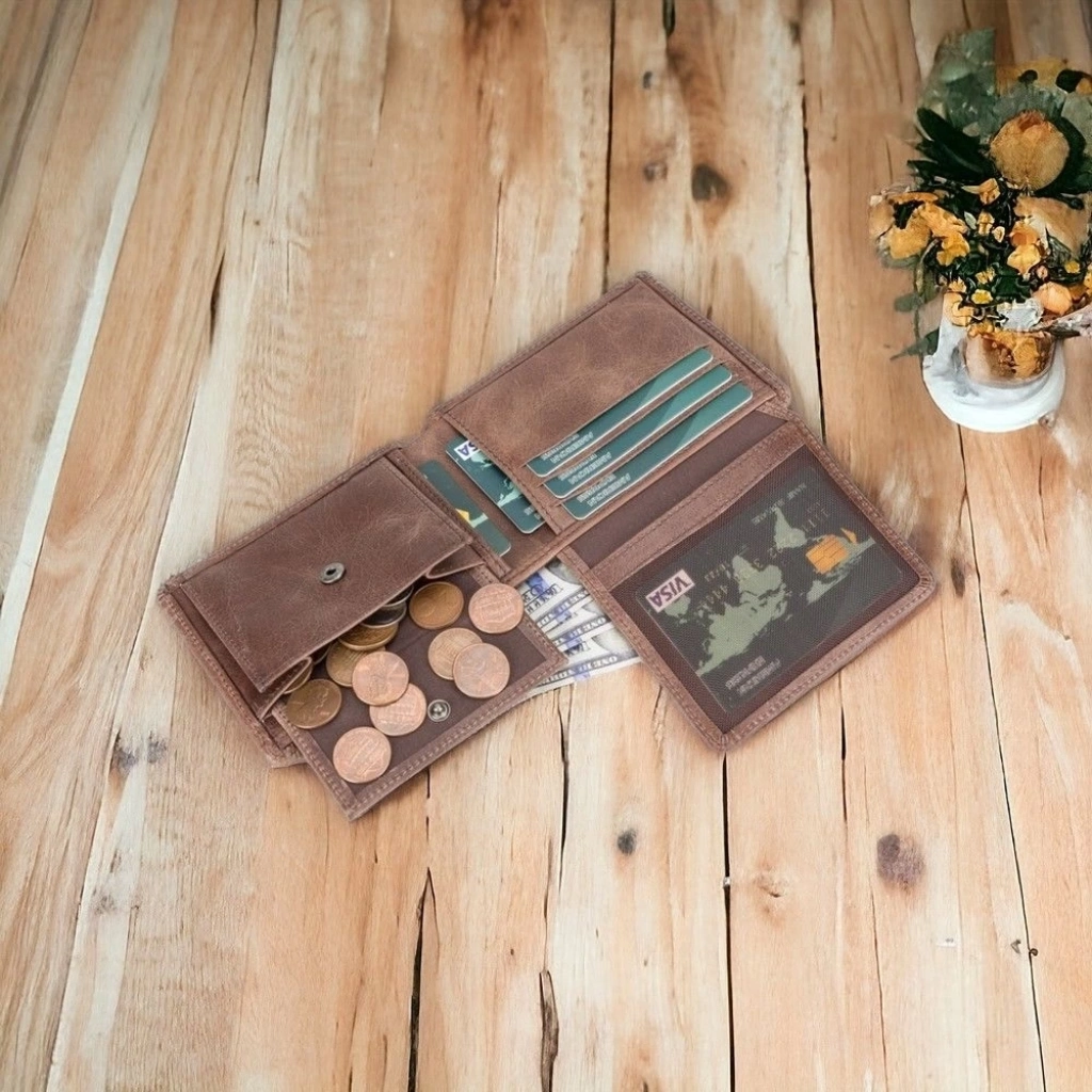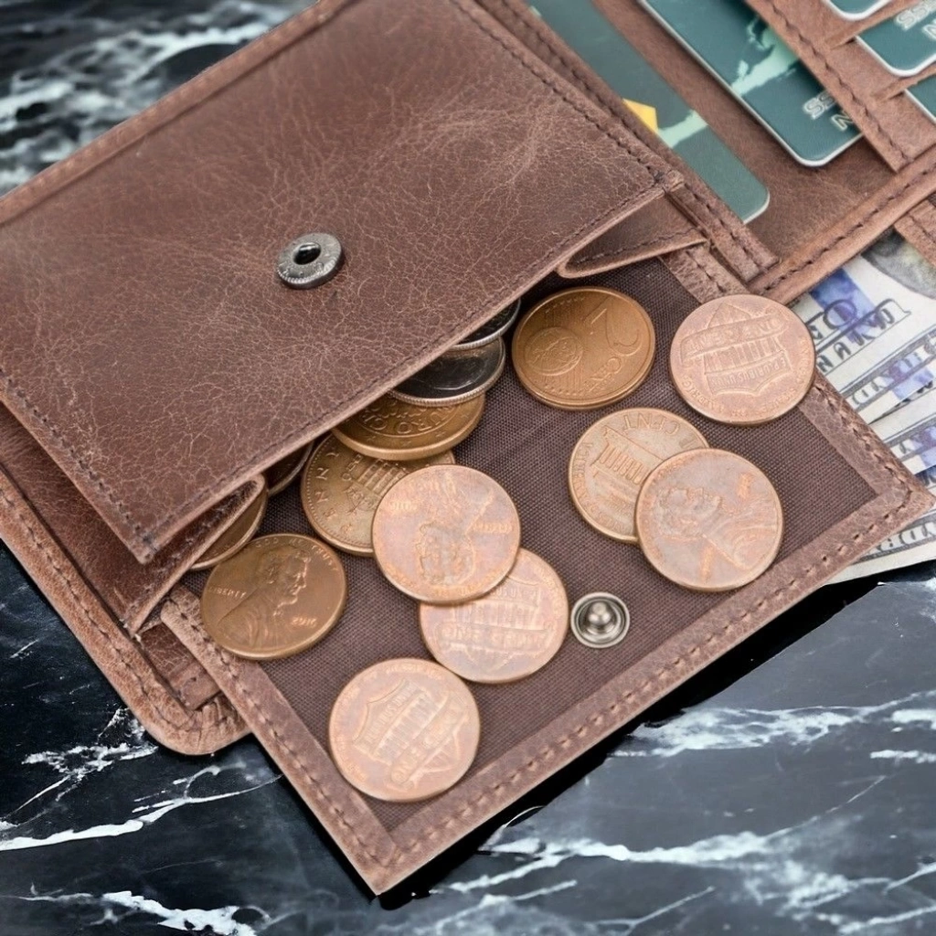 • Deri Cüzdan, 6 Kart ve Bozuk Para Bölmeli, Karamel Kahve Deri
