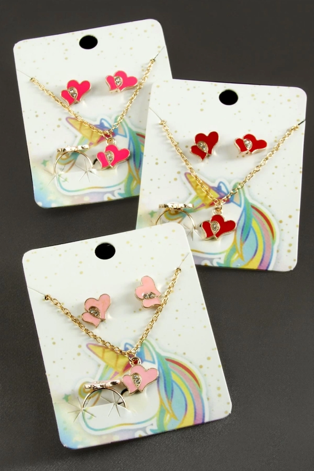 Kolye; Ürün malzemesi mine boyama,metal ve taştan üretilmiştir. 1 sınıf kaliteli malzeme kullanılmıştır. Ürün 1 adet kolye, 1 adet yüzük ve 1 adet çift küpe vardır. Ürün zincir uzunluğu 45 santimdir. Ürün ucundaki taşlı aparat boyu 1 cmdir. Ürün renkleri
