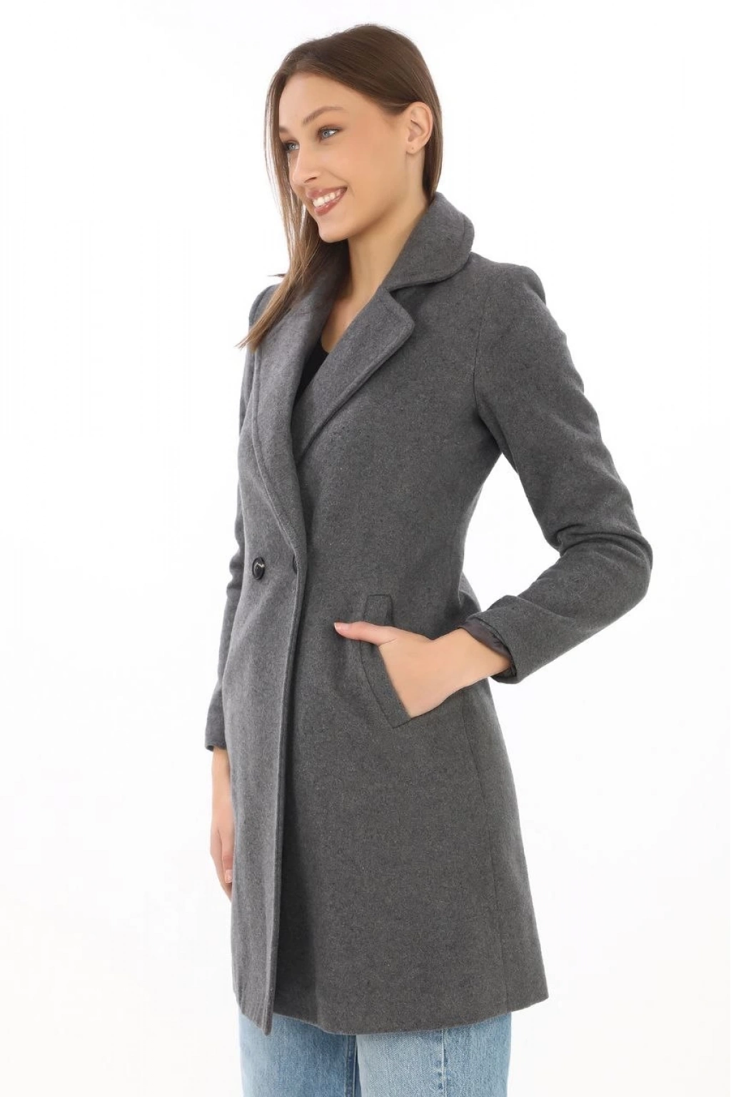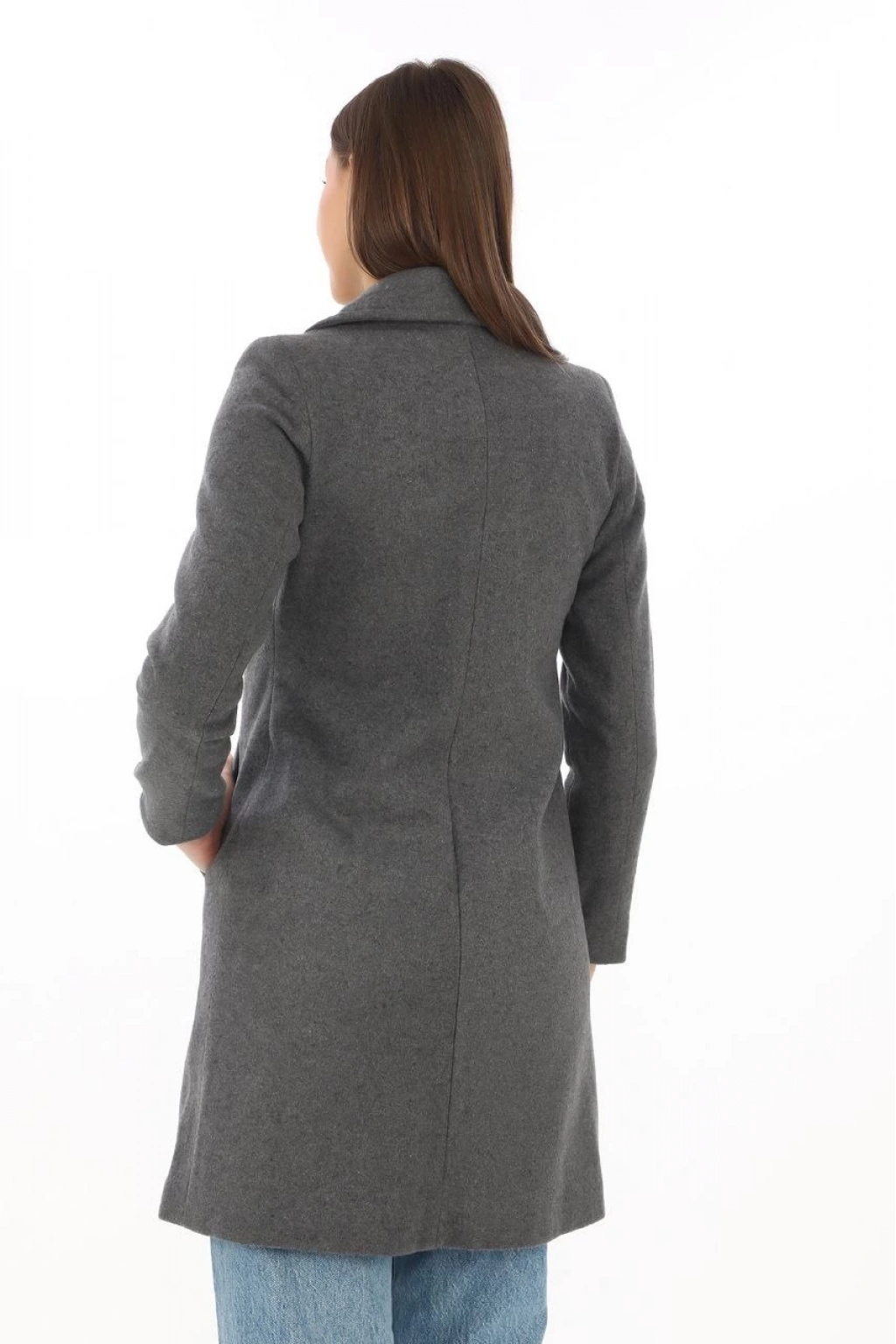 Kaşe Kaban – Siyah Yünlü Dokuma, Kruvaze Yaka, Astarlı, Cepli, Kuşaklı Uzun Boy Tesettür Uyumlu Kışlık Şık Kaban - Füme