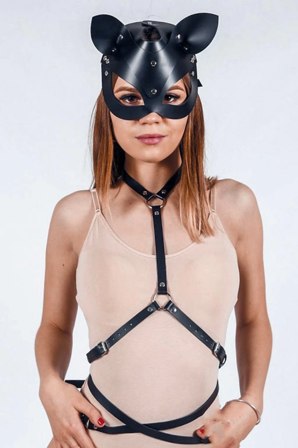 ÇOK SATAN Pamuktenim Özel Tasarım Kedi Maskeli Deri Fantezi Harness 7347