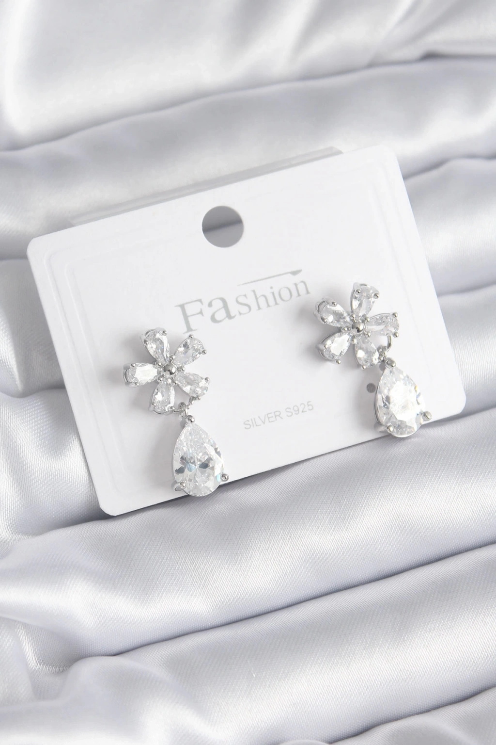 ÇOK SATAN Pirinç Gümüş Renk Zirkon Taşlı Çiçek Model Damla Model Kadın Küpe