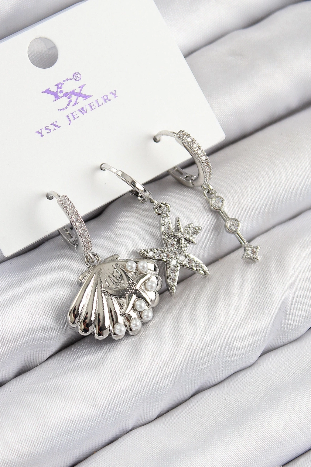 ÇOK SATAN Pirinç Zirkon Taşlı 3'lü Yıldız Ve İstiridye Model Gümüş Renk Kadın Küpe