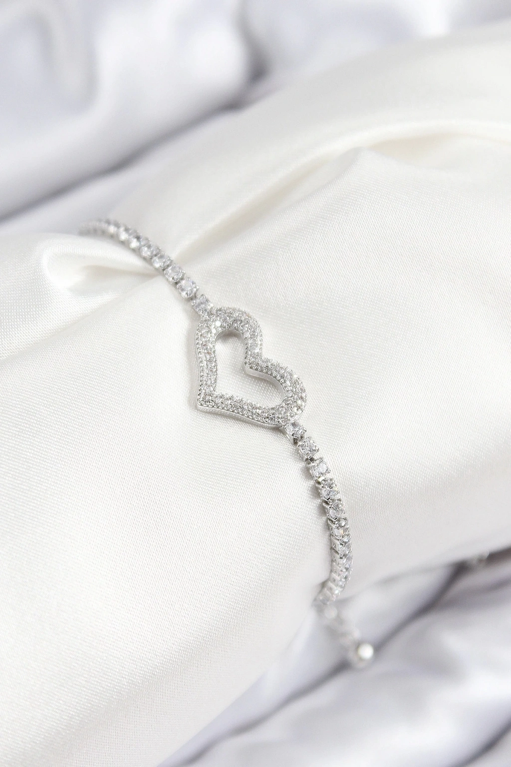 ÇOK SATAN Pirinç Zirkon Taşlı Kalp Model Gümüş Renk Asansörlü Kadın Bileklik