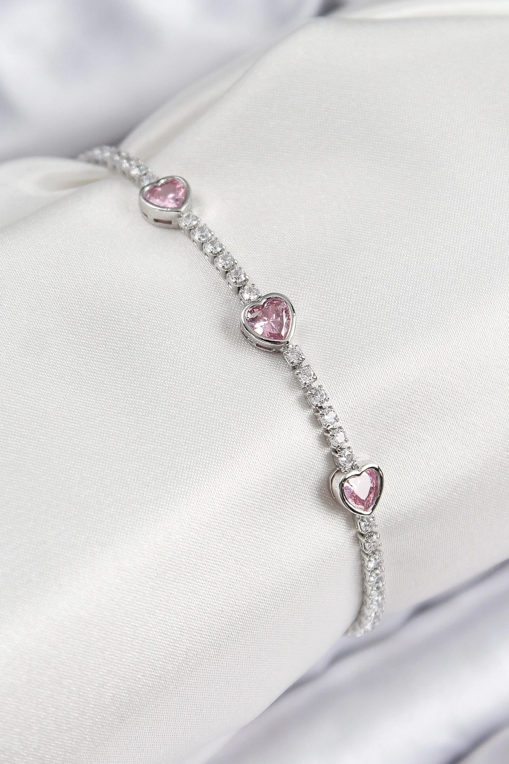 ÇOK SATAN Pirinç Zirkon Taşlı Pembe Kalp Model Gümüş Renk Kadın Bileklik