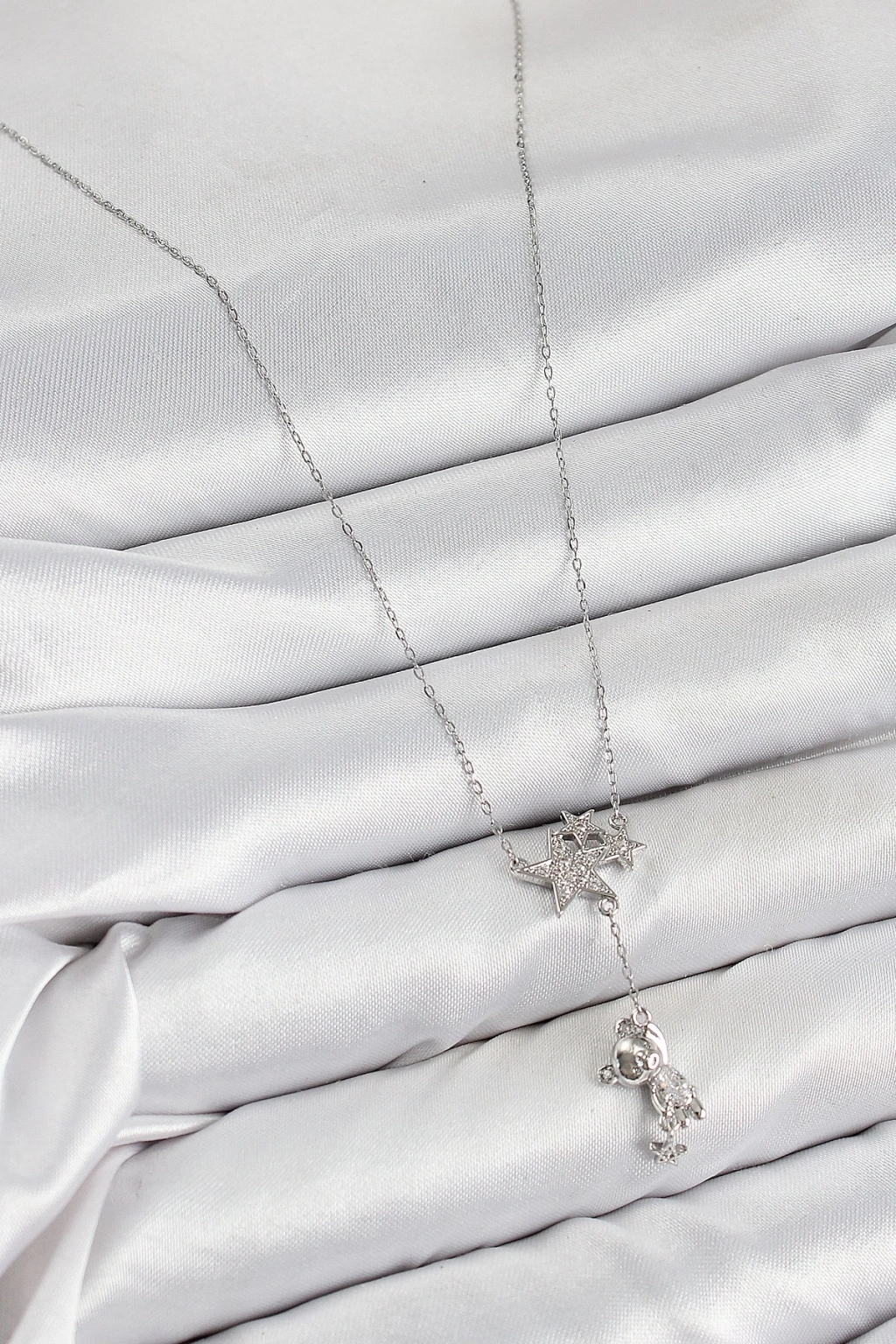 • Pirinç Zirkon Taşlı Sallantılı Ayıcıklı Yıldız Model Gümüş Renk Kadın Kolye