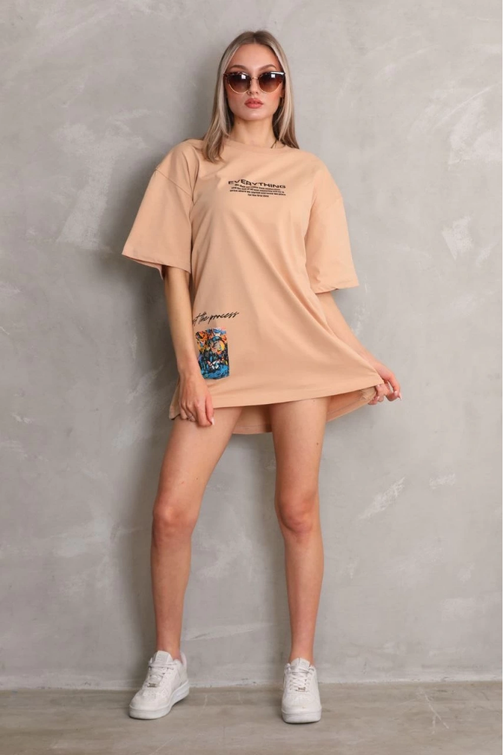 Bisiklet Yaka Baskılı Oversize T-Shirt - Bej