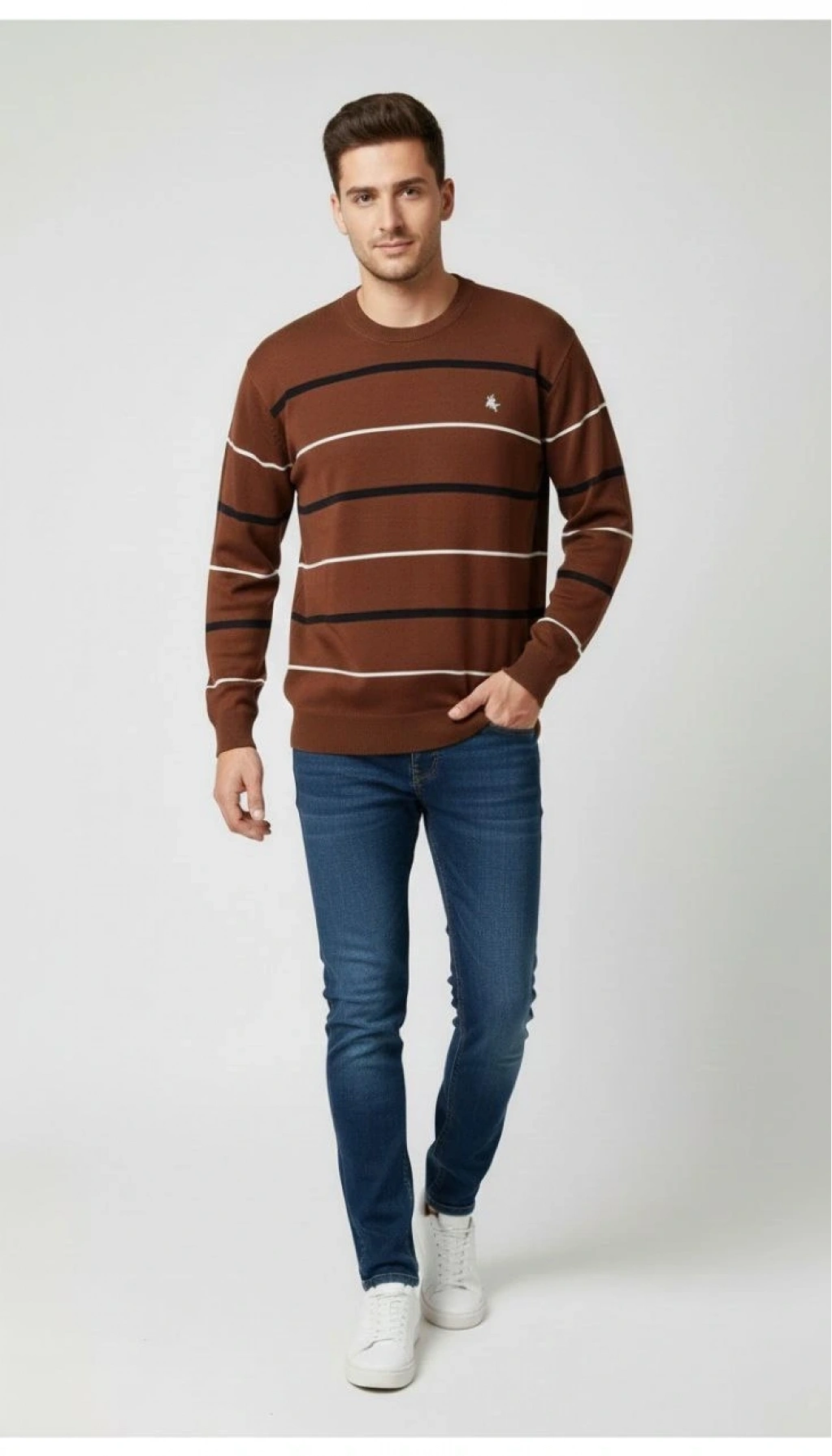 Bisiklet Yaka Cizgili Triko Kazak yumuşak dokulu Pamuklu ince Dokuma, uzun kollu Rahat Regular kalıp - Kahverengi