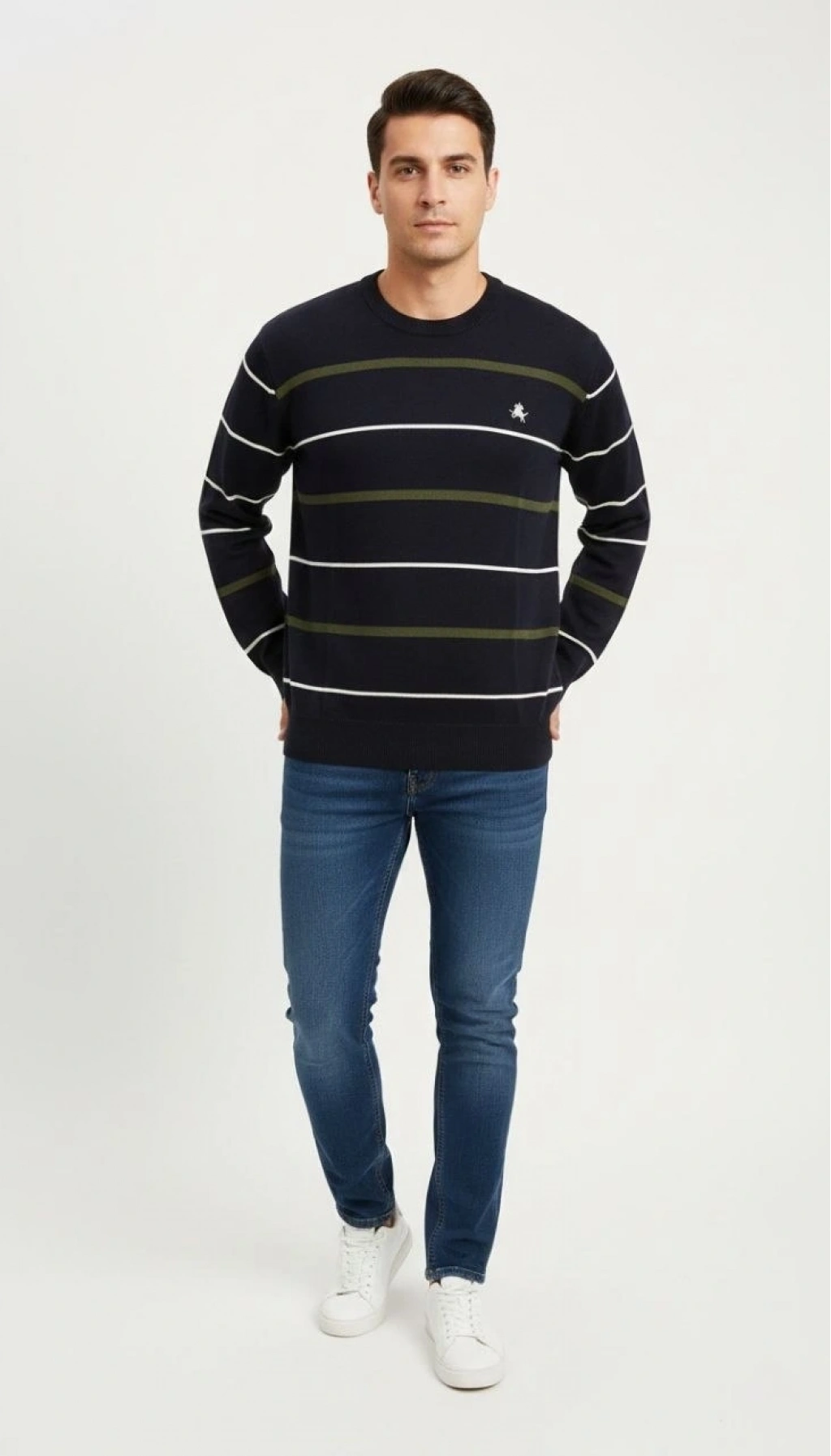 Bisiklet Yaka Cizgili Triko Kazak yumuşak dokulu Pamuklu ince Dokuma, uzun kollu Rahat Regular kalıp - Lacivert