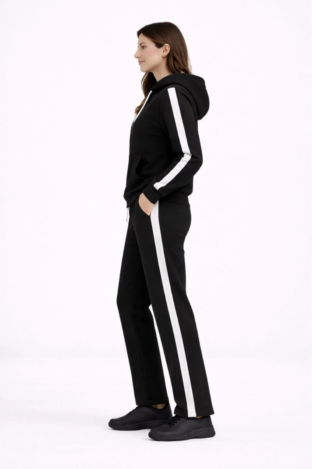 Yandan Şeritli Eşofman Takım Kapüşonlu Sweatshirt Boru Paça Alt, Oversize 3 iplik Pamuklu - Siyah