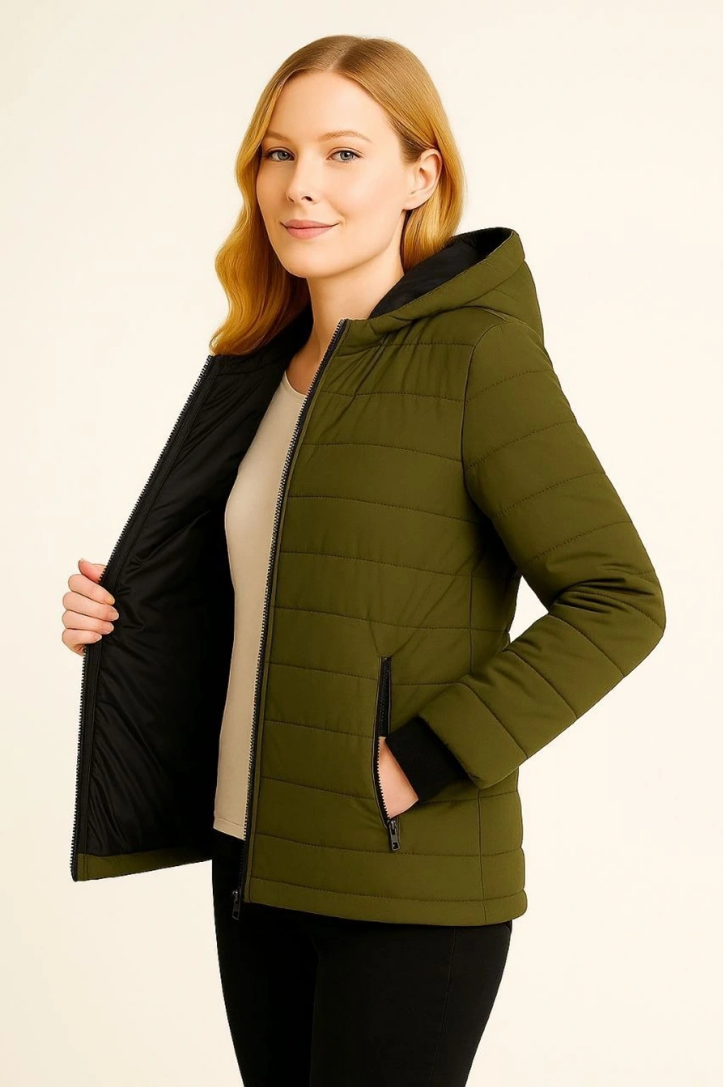 Şişme Kapüşonlu Fermuarlı Mont Su itici Kapitone Astarlı Kumaş Cepli Kışlık Rahat Kalıp - Haki