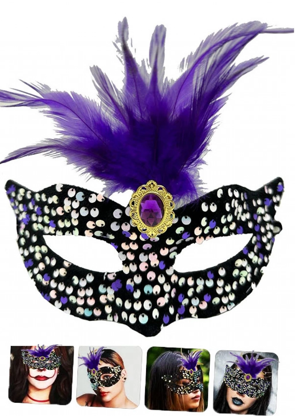 ÇOK SATAN Siyah Kadife Payetli Pullu Mor Tüylü Parti Maskesi