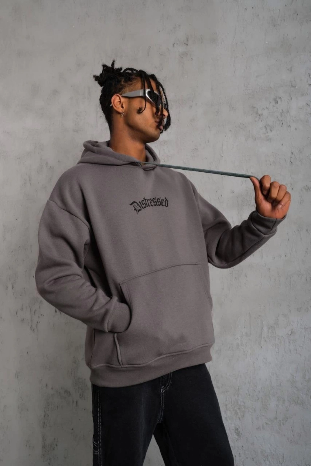 Üç İplik Baskılı Kapüşonlu Sweat - Gri
