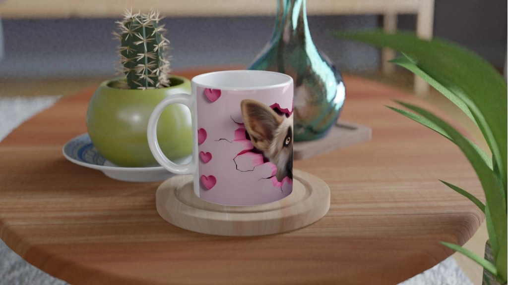 Duvarı Delen Alman Kurdu Temalı Baskılı Kupa Bardak, pembe kalplerle bezeli fon üzerinde çatlamış duvardan bakan sevimli bir Alman kurduyla tasarlandı. Bu özel kupa, hem köpek severler için duygusal bir bağ kuruyor hem de her yudumda yüzlerde tebessüm bırakıyor.