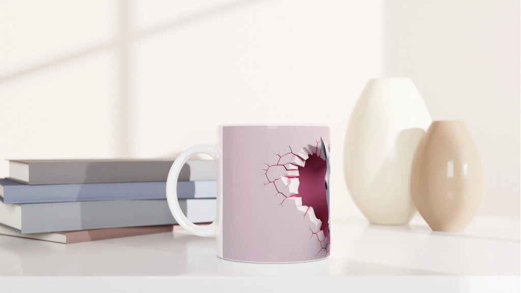 Duvarı delerek bakan bembeyaz bir at figürü, sade ama etkileyici bir estetik sunuyor. Hayvanseverler ve doğaya tutkun ruhlar için ideal bir kupa tasarımı.